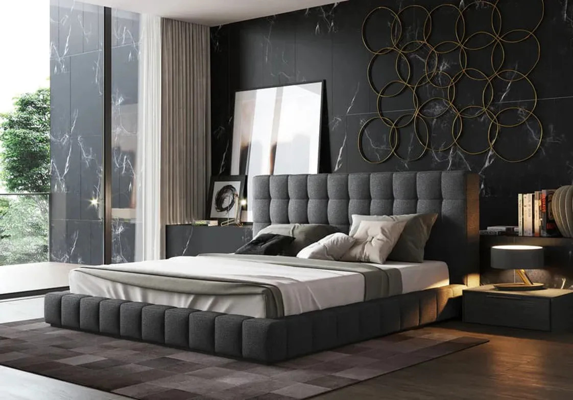 لوح رأسي مبطن بتفاصيل مربعة يعزز من فخامة التصميم ويوفر راحة إضافية