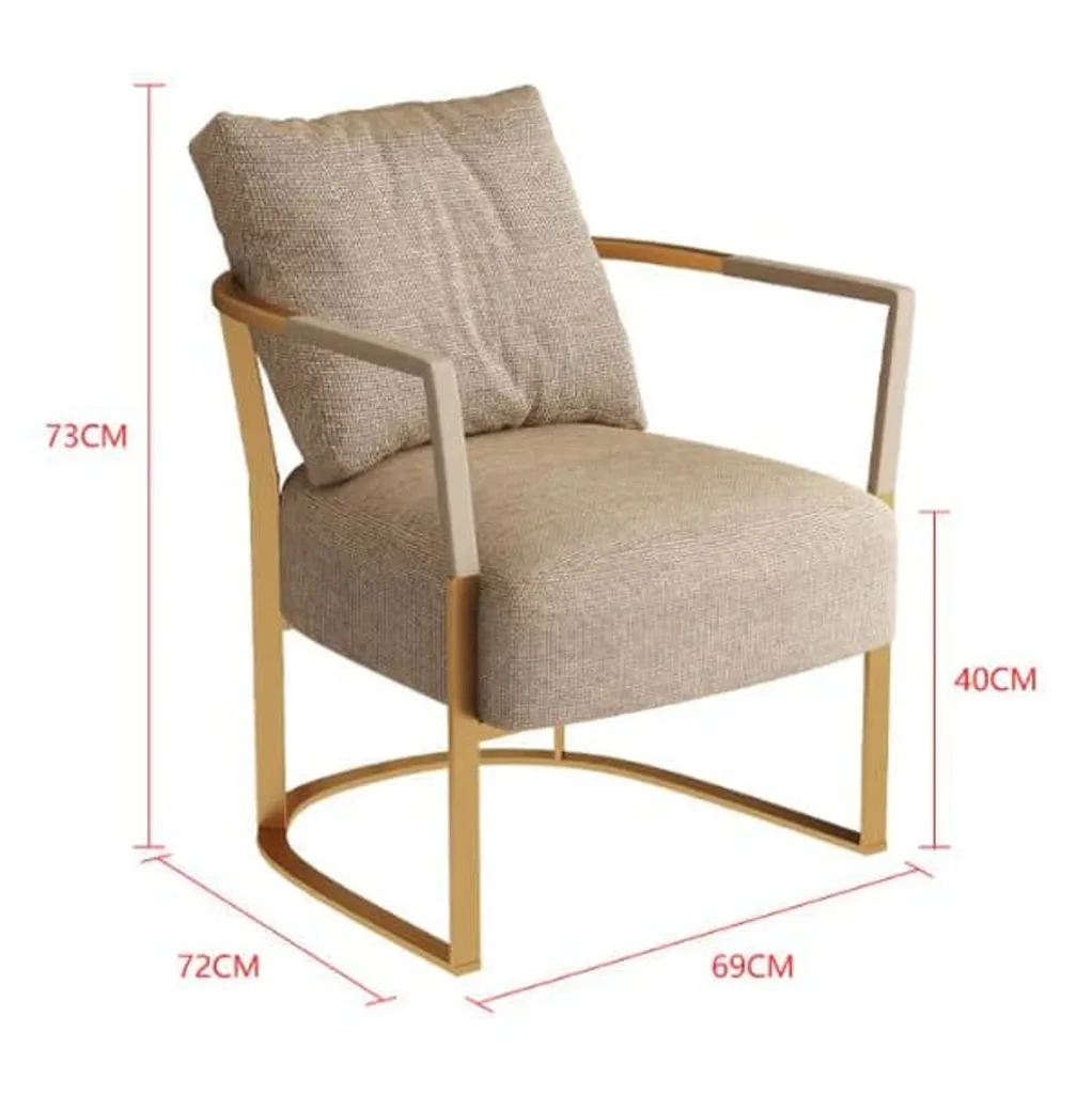 أضف لمسة من الأناقة العصرية إلى منزلك أو مكتبك مع هذا الكرسي المميز بتصميمه العصري والجذاب. يتميز بهيكل معدني بلون ذهبي فاخر مع مساند للذراعين لتعزيز الراحة، بينما يمنح التنجيد بالقماش البيج الفاتح إحساساً بالدفء والفخامة.