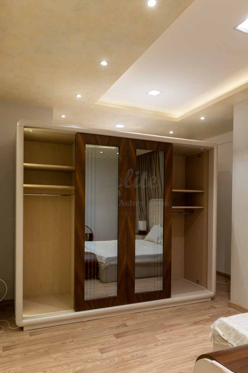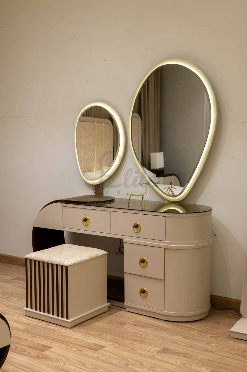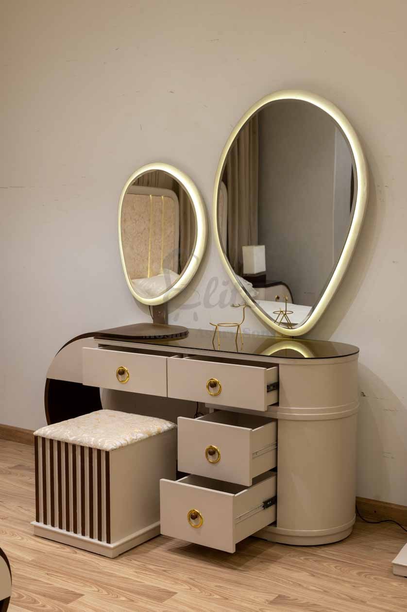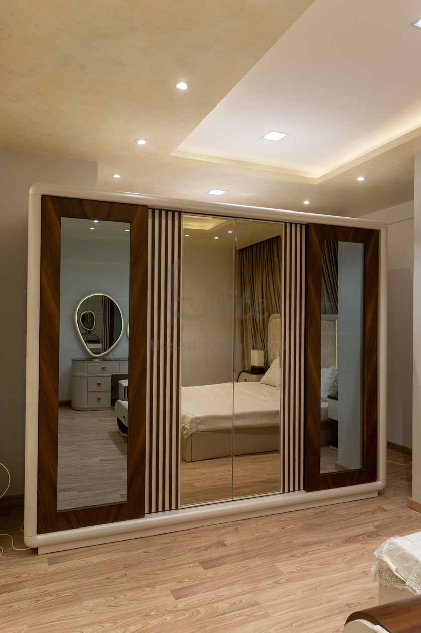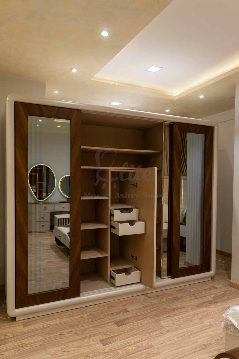 اللون البيج مع البني الخشبي يعكسان الفخامة والراحة، مع حلول تخزين ذكية لمساعدتك في تنظيم المساحة بشكل مثالي.