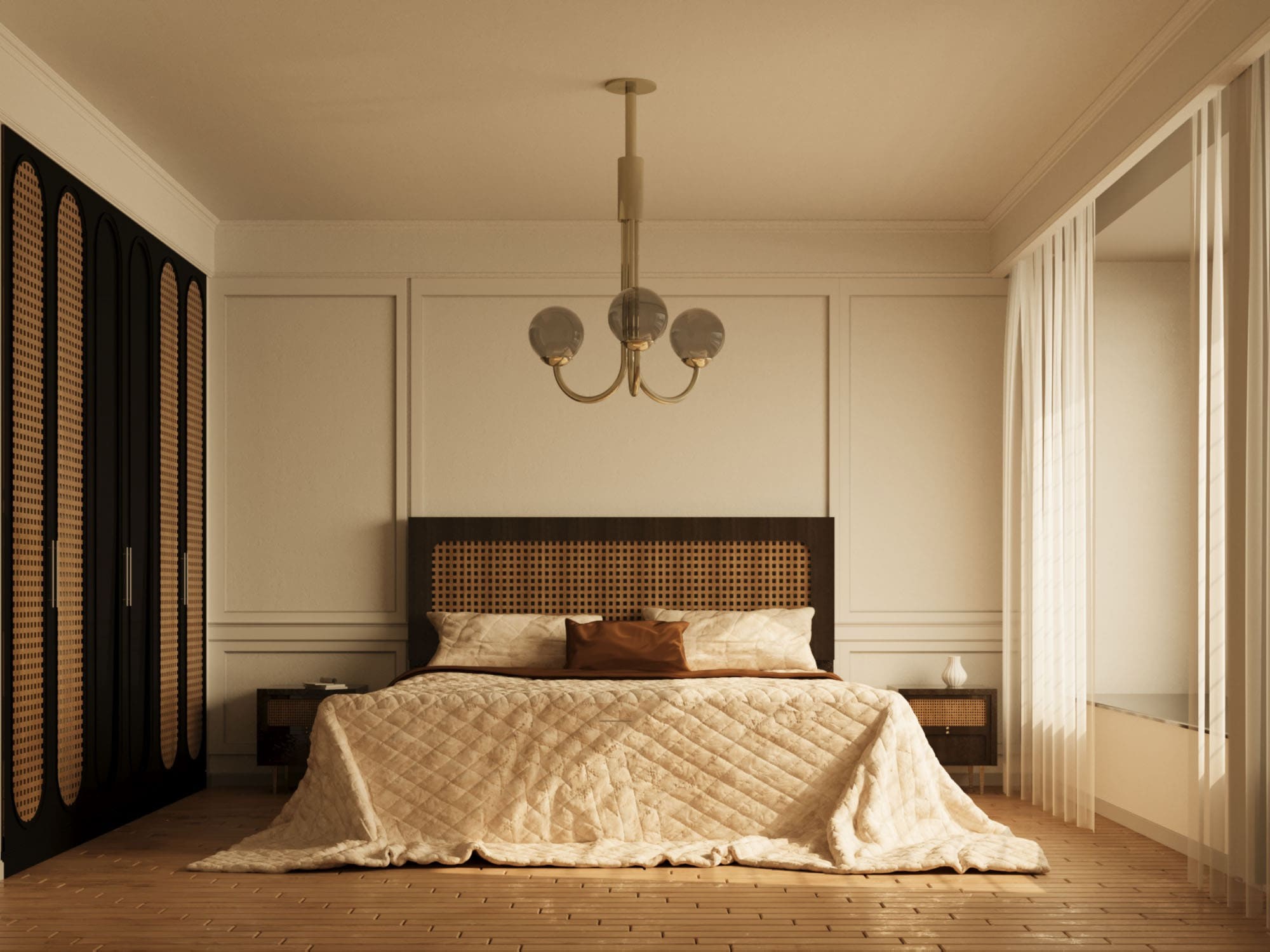 غرفة نوم مودرن باللون البيج والبني الخشبي — تصميم أنيق ومساحات تخزين عملية