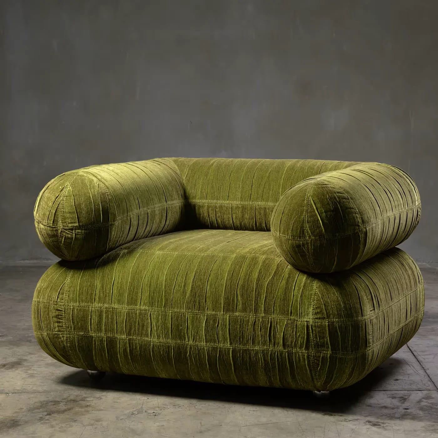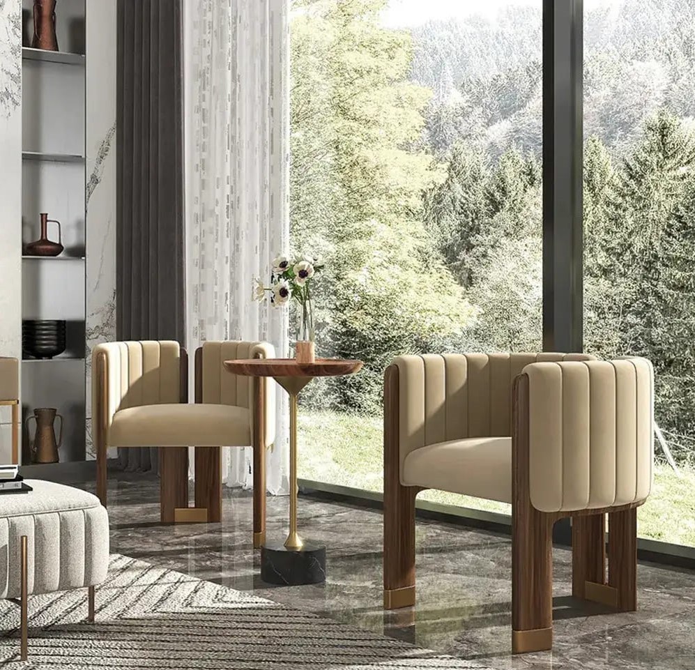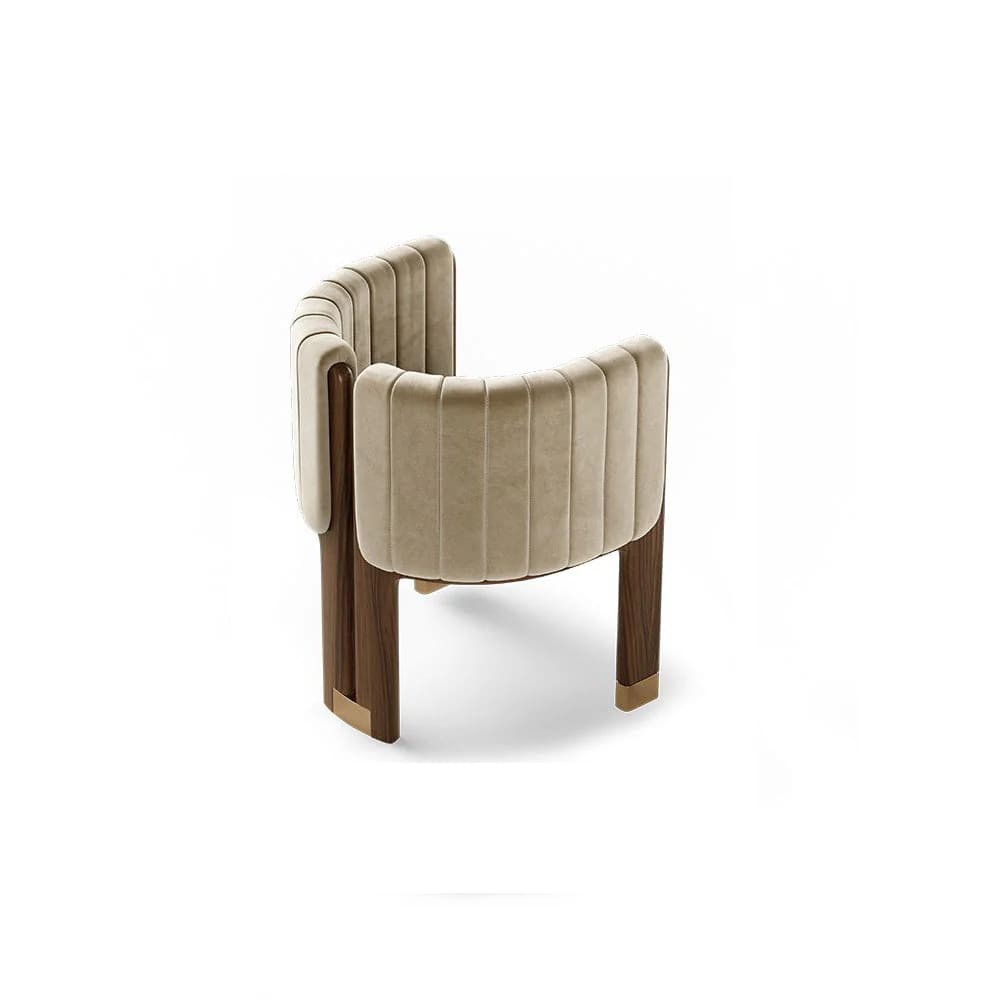تكتمل أناقة الكرسي بوجود أرجل وذراعين من الخشب بتشطيب داكن، مما يمنح القطعة مظهرًا متينًا ومتناغمًا مع باقي عناصر الأثاث.