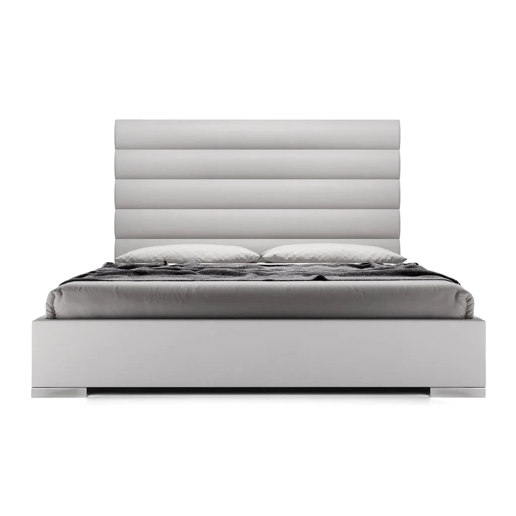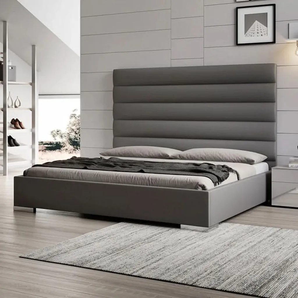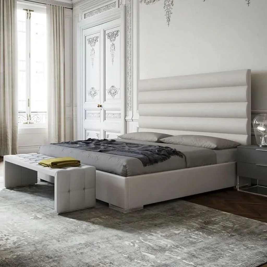 سرير بتصميم عصري مميز، يتمتع برأسية مبطنة بجلد فاخر بأقسام أفقية متساوية الحجم. القاعدة السفلية مصنوعة من خشب عالي الجودة، مما يضمن متانة وثبات السرير. تصميمه البسيط والأنيق يجعله مناسبًا تمامًا لغرف النوم العصرية. يتوفر باللونين الأبيض والرمادي لإضفاء طابع هادئ ومريح على المساحة.