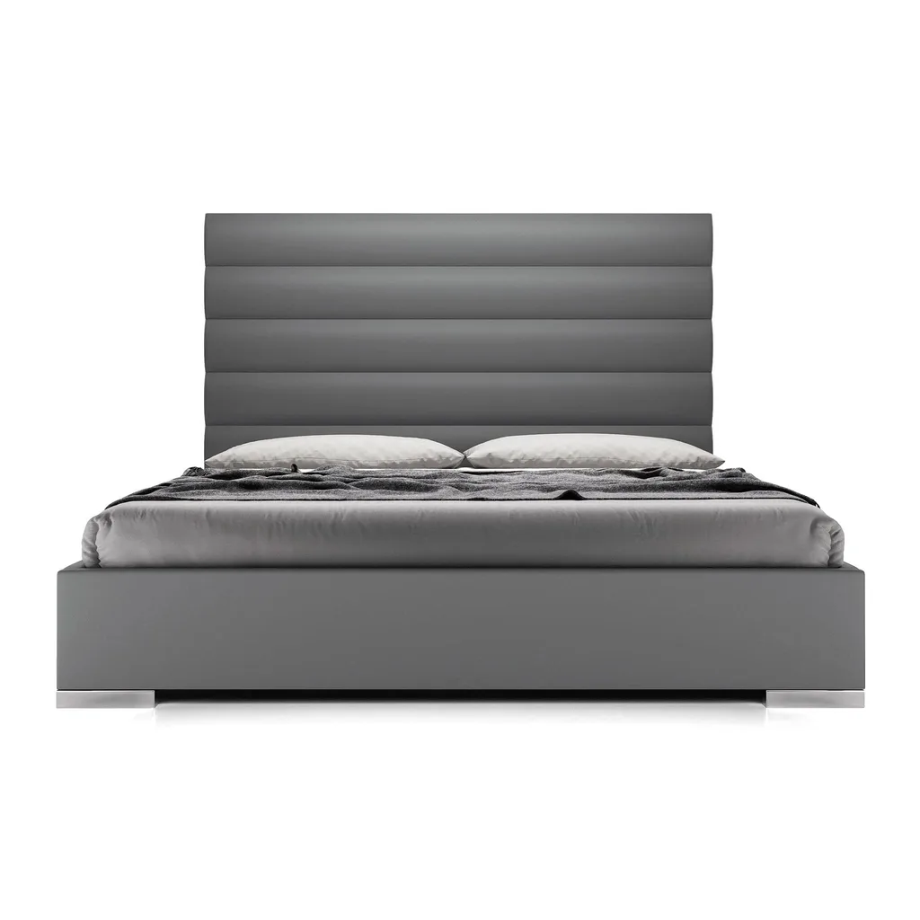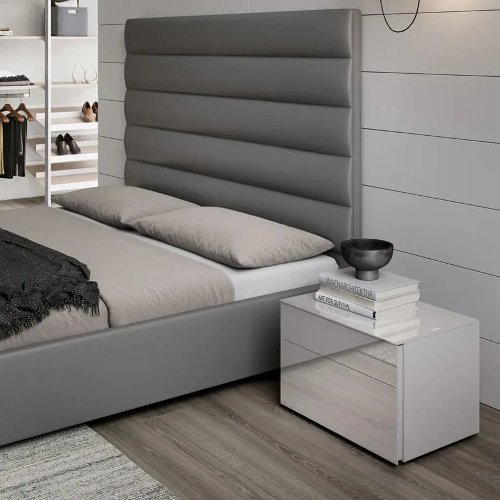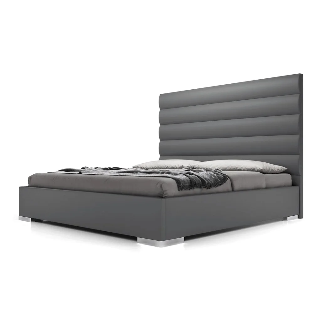 سرير بتصميم عصري مميز، يتمتع برأسية مبطنة بجلد فاخر بأقسام أفقية متساوية الحجم. القاعدة السفلية مصنوعة من خشب عالي الجودة، مما يضمن متانة وثبات السرير. تصميمه البسيط والأنيق يجعله مناسبًا تمامًا لغرف النوم العصرية. يتوفر باللونين الأبيض والرمادي لإضفاء طابع هادئ ومريح على المساحة.