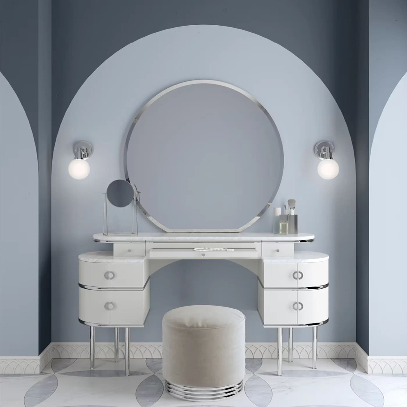 البف الدائري المرافق مبطن بقماش ناعم باللون الوردي أو الأبيض مع قاعدة معدنية متناسقة، ليمنحك راحة وأناقة في آن واحد.