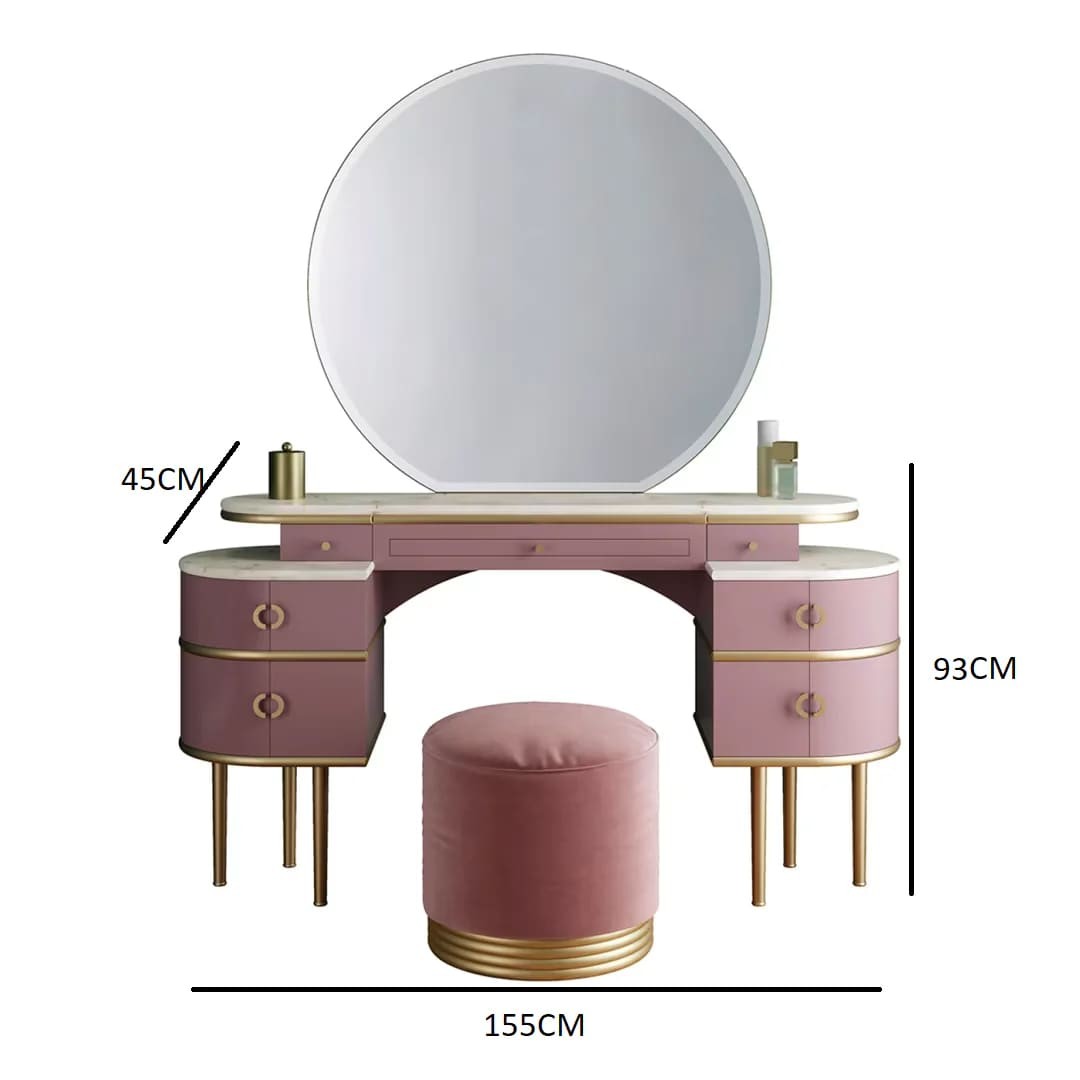 تألقي مع هذه التسريحة الأنيقة بتصميم عصري، بسطح خشبي باللون الوردي مع لمسات ذهبية راقية أو باللون الأبيض مع تفاصيل فضية فاخرة. تأتي بمرآة دائرية كبيرة وثابتة لرؤية واضحة، وأربعة أدراج واسعة بمقابض ذهبية دائرية لسهولة التخزين والتنظيم.
