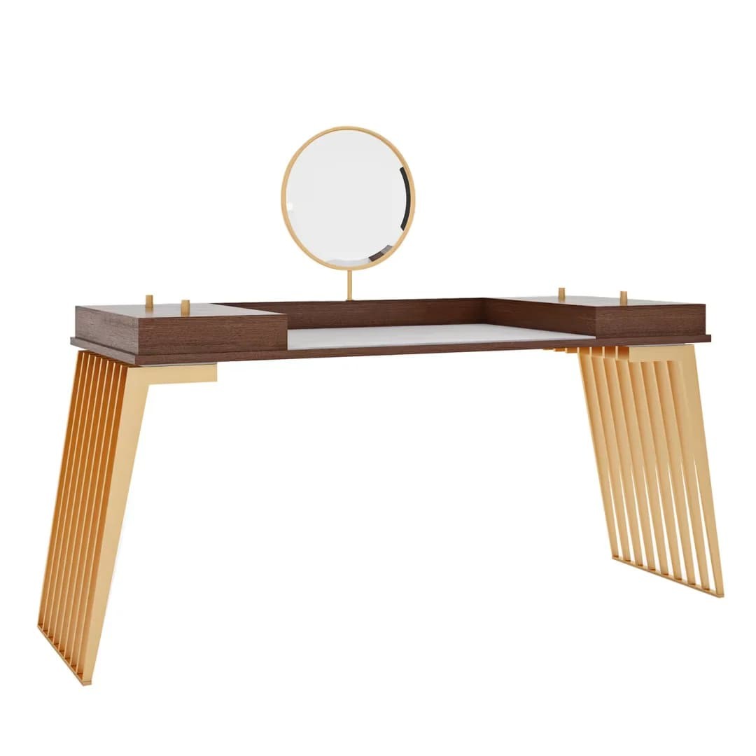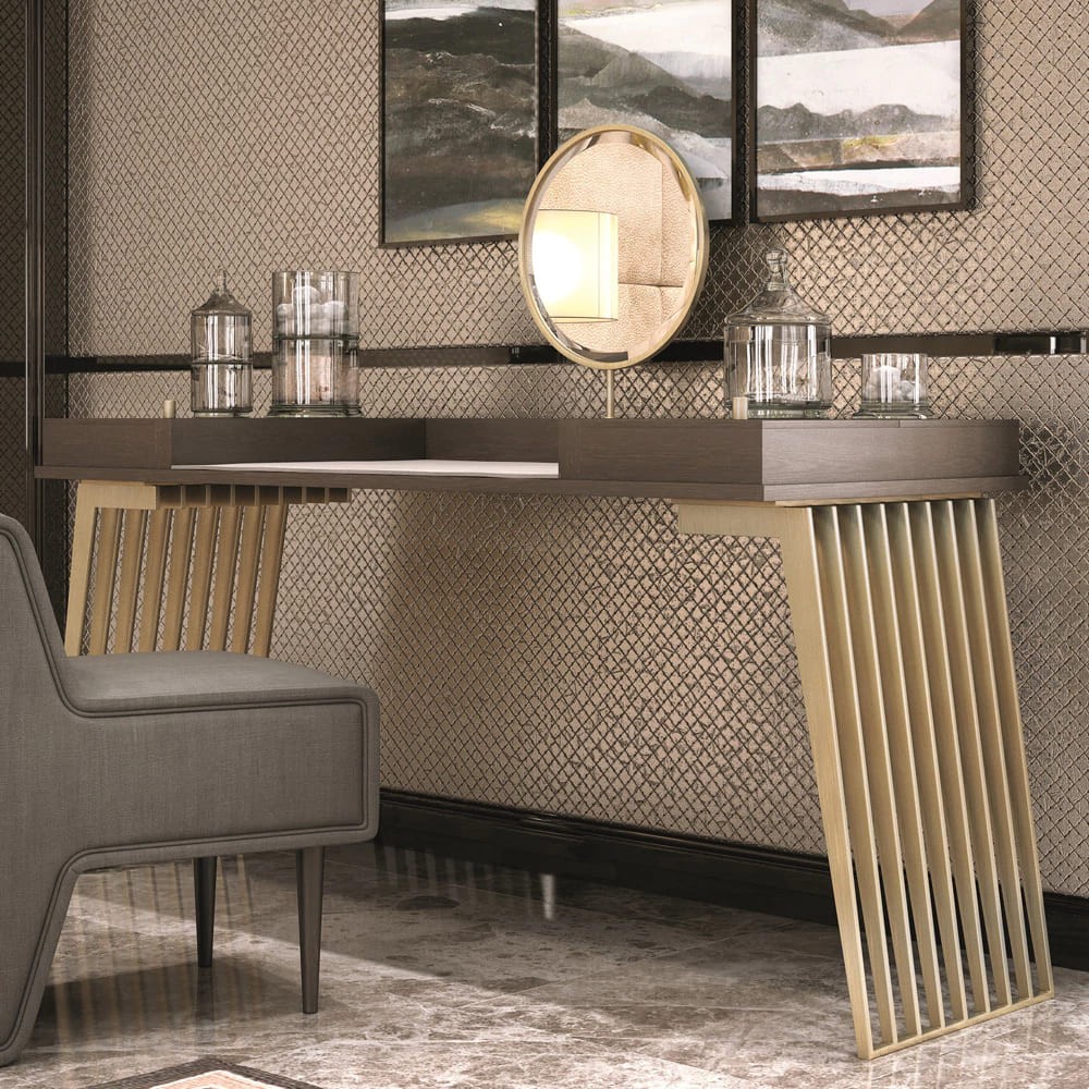 تسريحة خشبية بتصميم أنيق مع أرجل ذهبية وبف عصري – إضافة فاخرة لغرف النوم