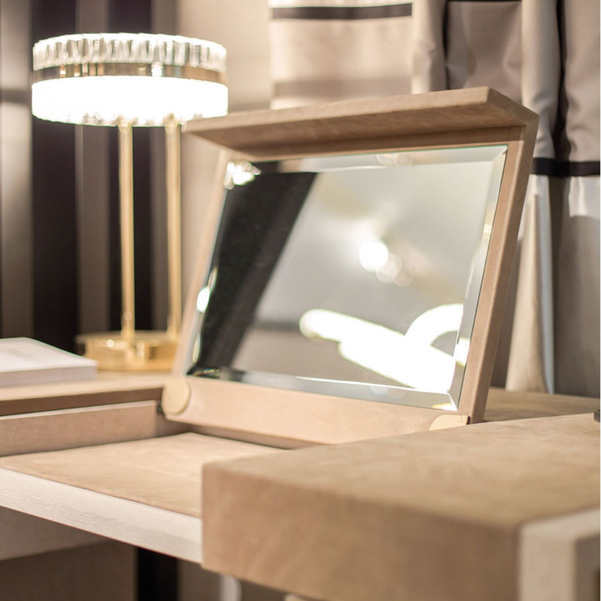 تسريحة خشب طبيعي بلمسات جلدية ومرآة مخفية مع بف فاخر بلون بيج – تصميم أنيق وعصري لغرف النوم