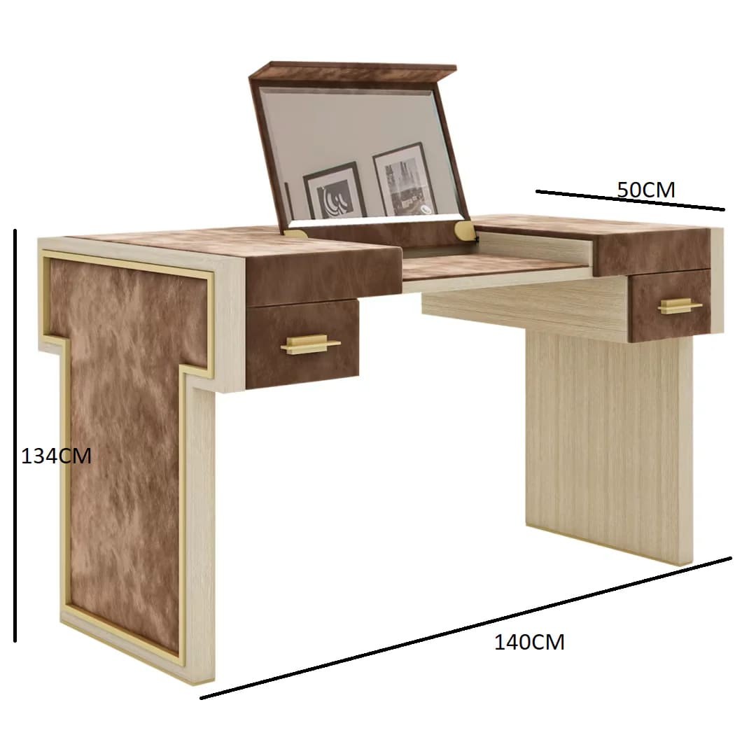 تسريحة مصنوعة من خشب طبيعي متين، مزينة بلمسات جلدية أنيقة تضفي عليها طابعًا فاخرًا. تحتوي على درجين صغيرين بمقابض ذهبية، توفران مساحة عملية لتنظيم الأغراض الشخصية. الجزء العلوي مزود بمرآة قابلة للرفع، مما يجعلها مثالية للاستخدام اليومي وتنظيم مستحضرات التجميل والمجوهرات.