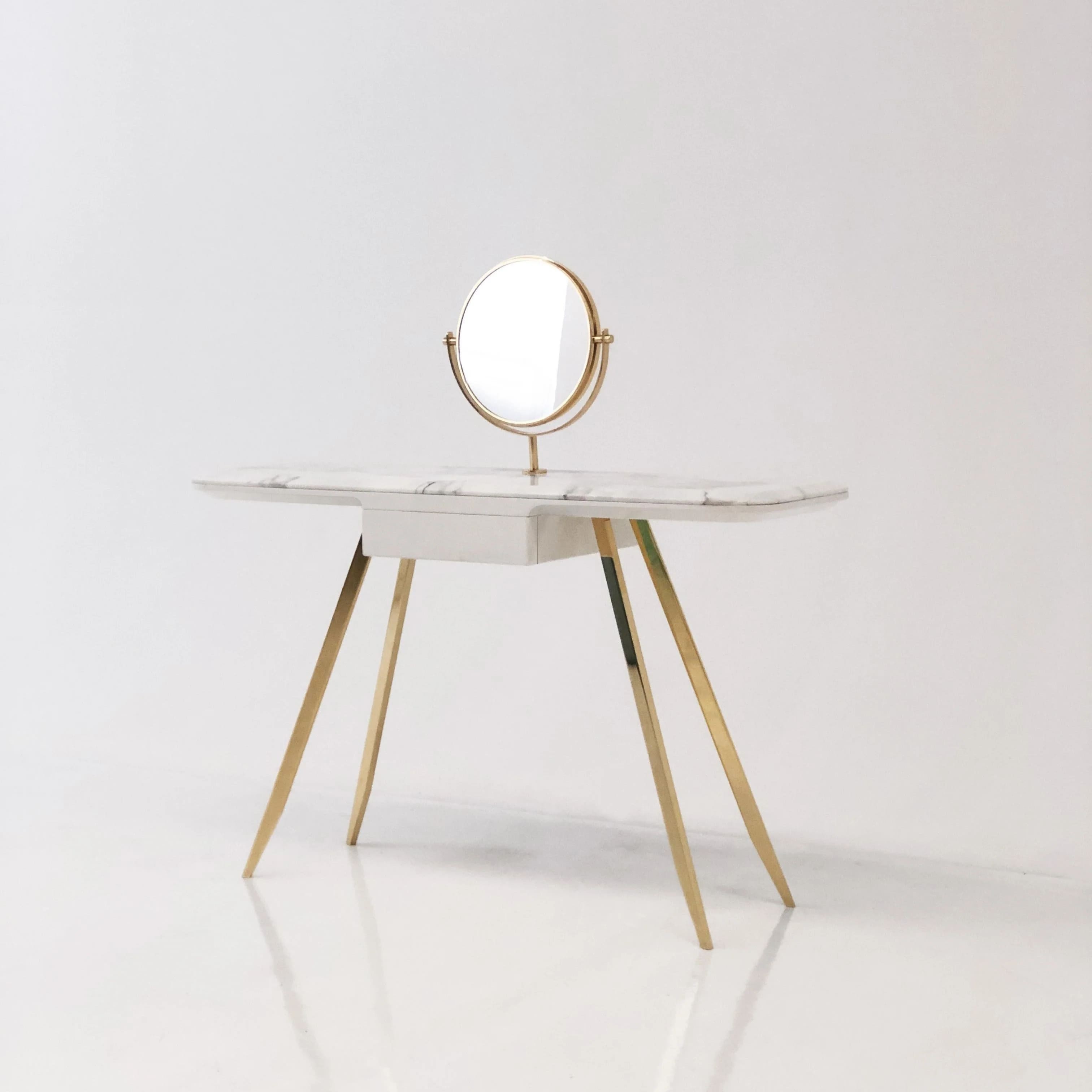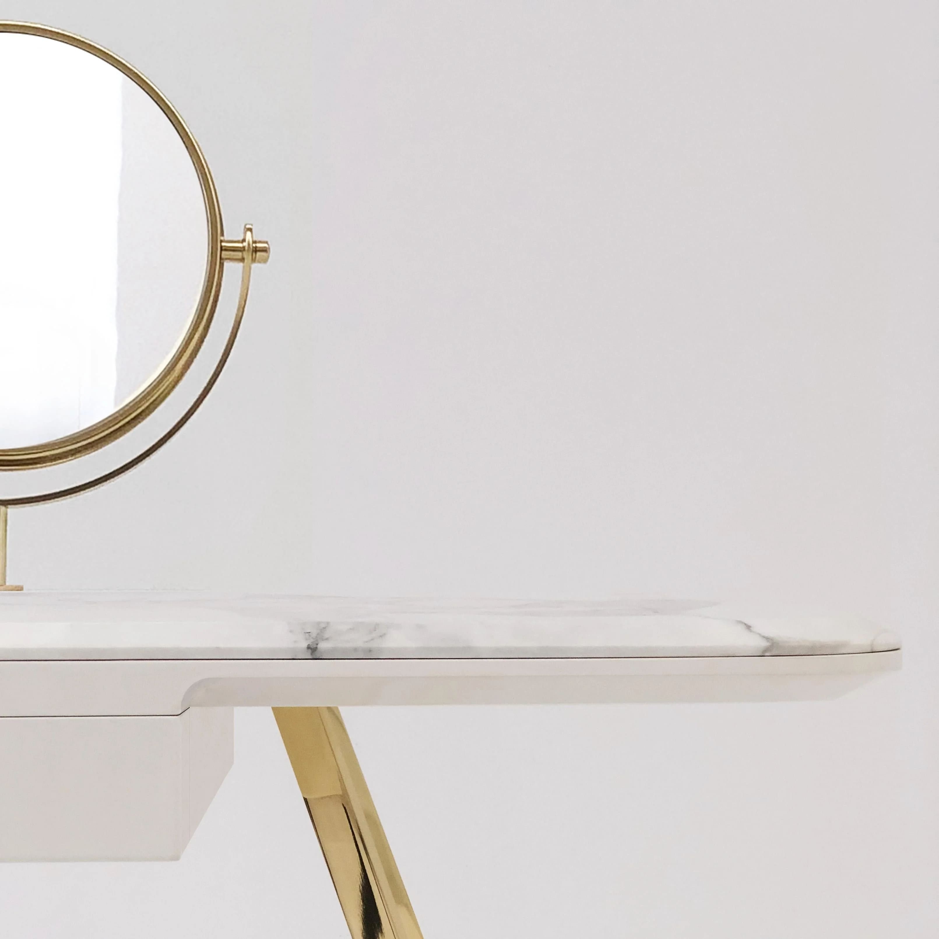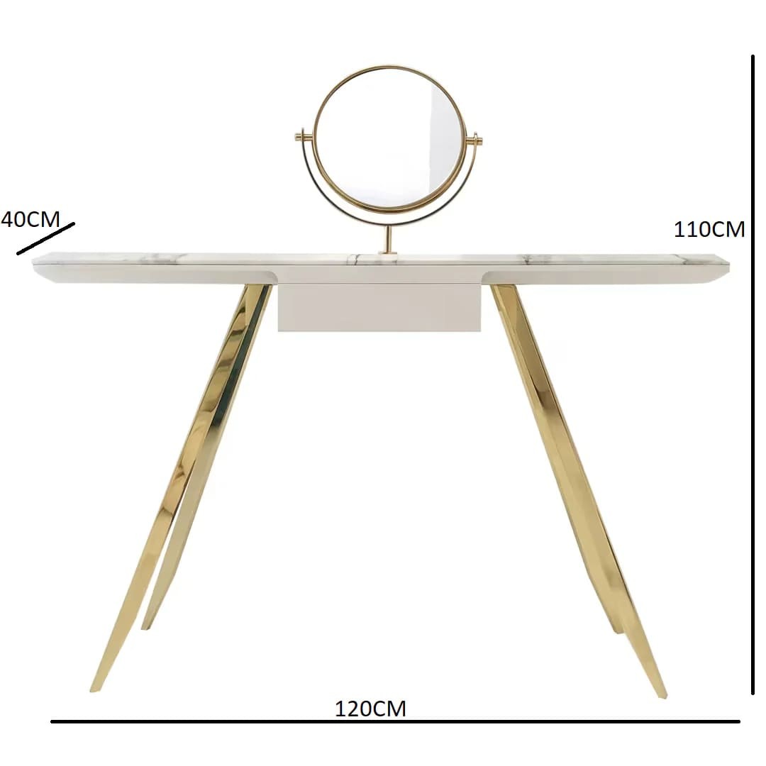 تجمع هذه التسريحة بين الأناقة والعملية بتصميم عصري ومميز. هيكلها المصنوع من الرخام الأبيض الفاخر يمنحها مظهرًا نظيفًا ومتناسقًا، مما يضفي لمسة من الفخامة على أي غرفة. الأرجل الذهبية المائلة تضيف لمسة راقية وتوفر ثباتًا قويًا للتسريحة.