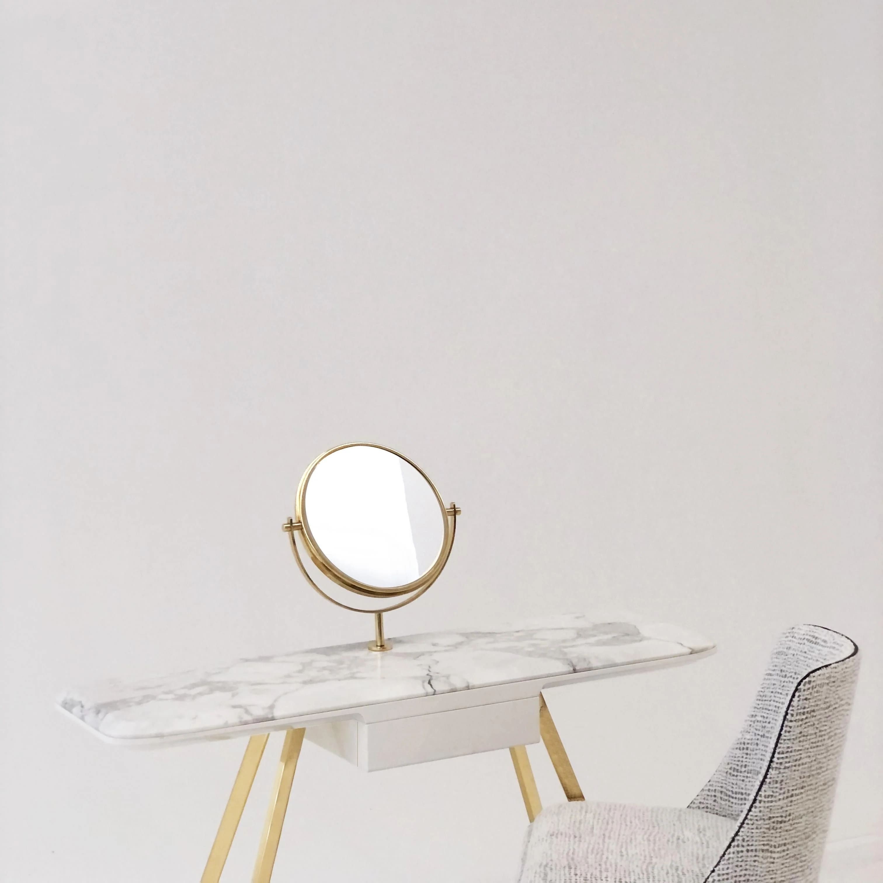 تسريحة رخامية بيضاء مع أرجل ذهبية ومرآة دائرية – تصميم عصري فاخر لغرف النوم