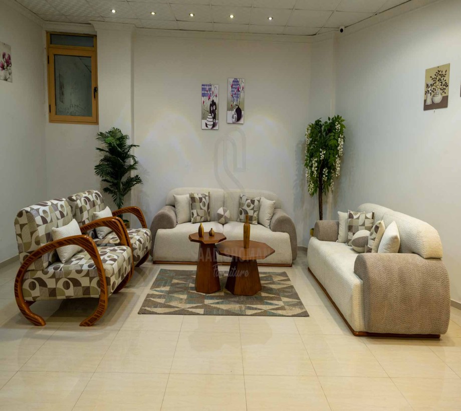 امنحي منزلك لمسة من الأناقة مع الأنتريه المودرن الذي يجمع بين اللون البيج الدافئ ولمسات الخشب الطبيعي الفاخر. يتميز هذا الأنتريه بتصميم عصري وأنيق مع قماش بوكليه عالي الجودة الذي يمنحك راحة استثنائية ودعماً ممتازاً في كل الجلسات.