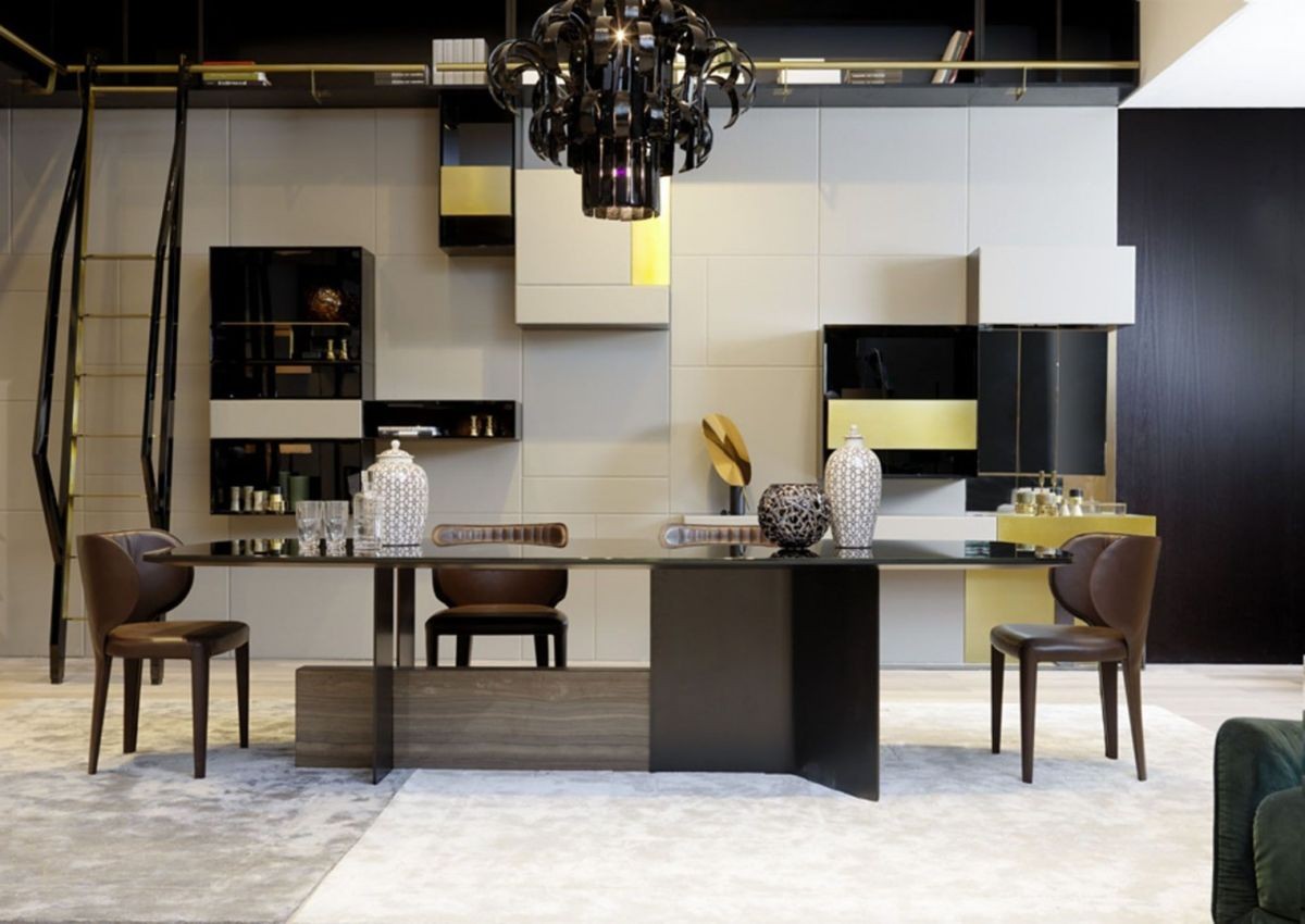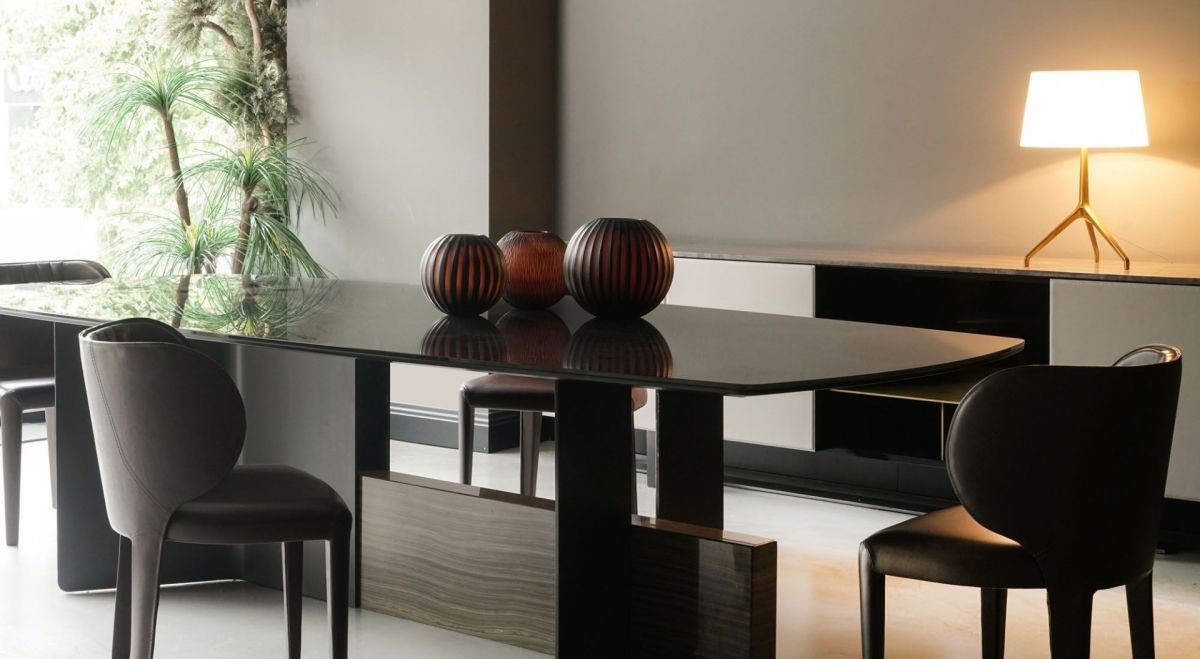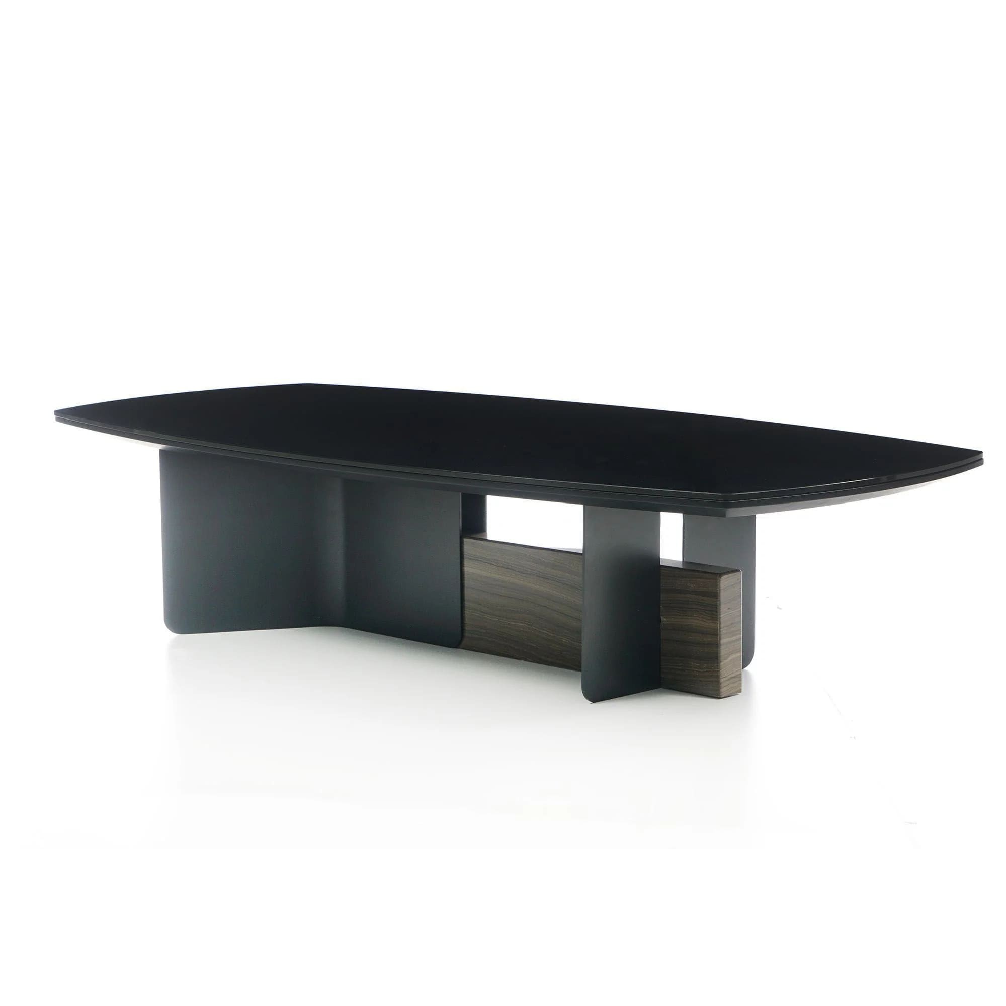 طاولة طعام مستطيلة بسطح أسود وقاعدة هندسية عصرية