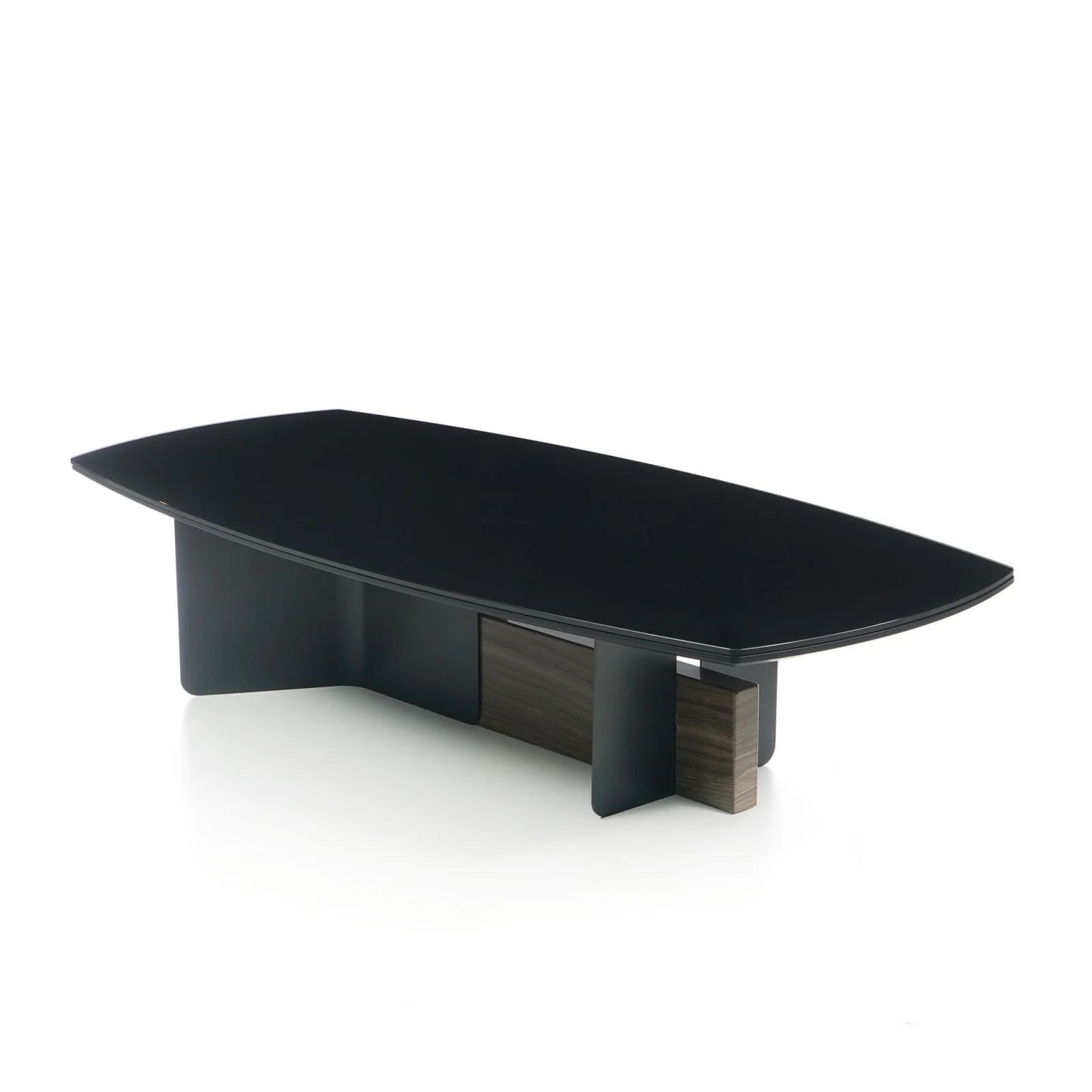 يعتمد تصميم القاعدة على مزيج من العناصر الخشبية باللون الأسود والخشبي الطبيعي، مصممة بشكل هندسي فريد مع ألواح متقاطعة تخلق توازنًا بصريًا رائعًا وتمنح الطاولة ثباتًا وأناقة في آنٍ واحد.