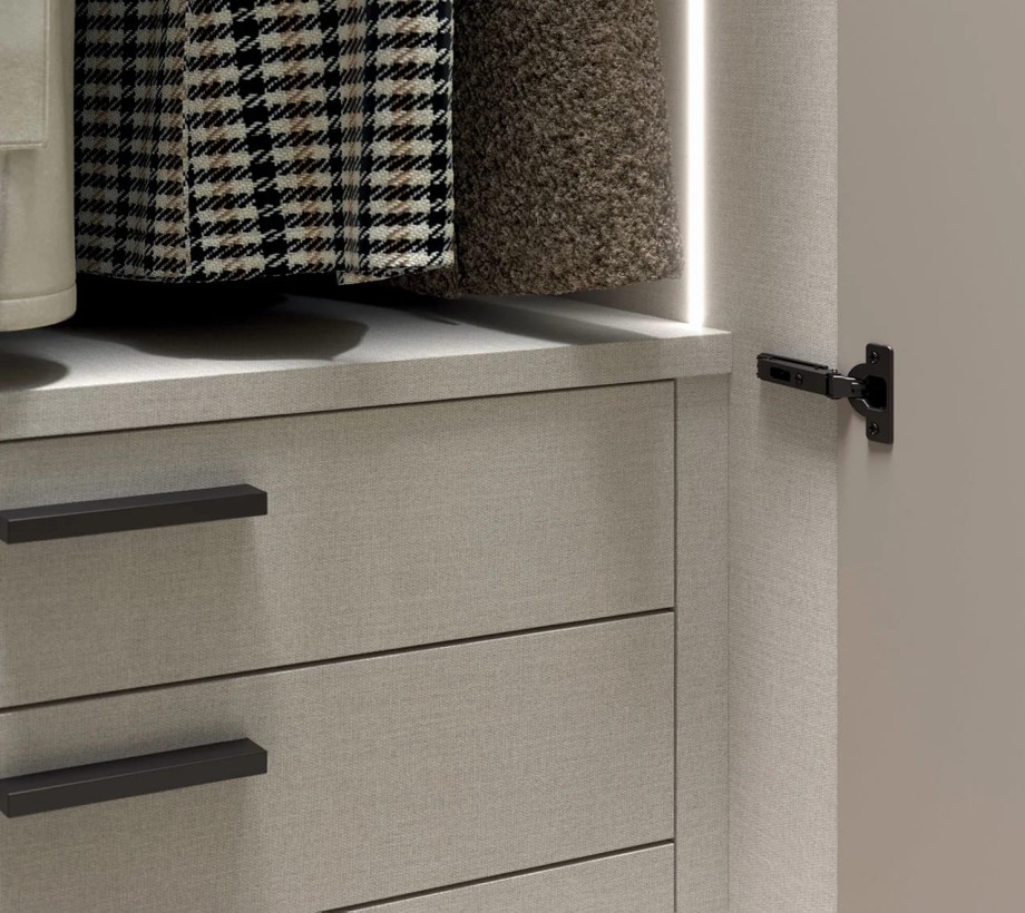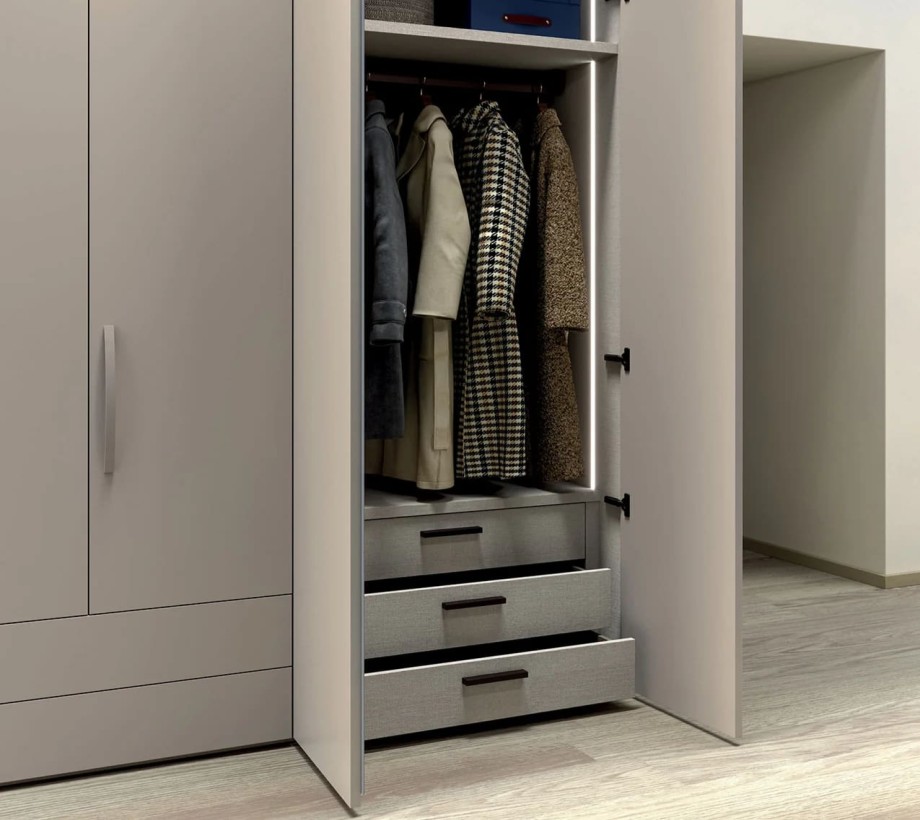 دولاب ملابس عصري بأبواب كبيرة وأربعة أدراج بتصميم بسيط باللون الرمادي الفاتح
