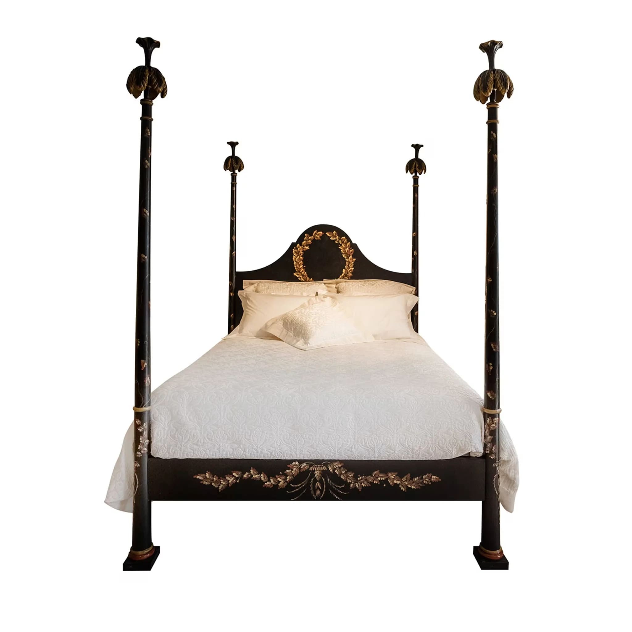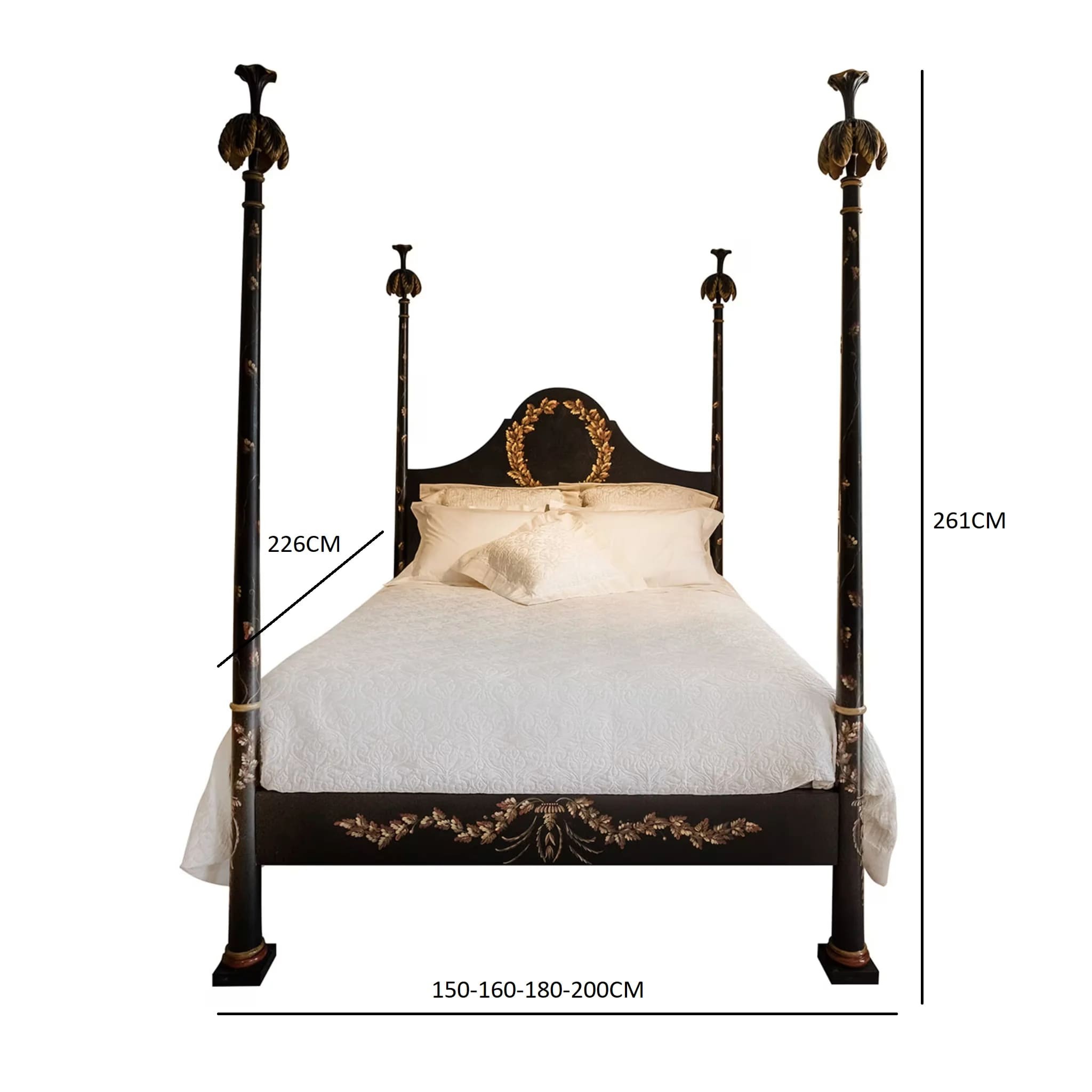 يأتي السرير مزينًا بنقوش ذهبية أنيقة على الأعمدة الأربعة وعلى اللوحة الأمامية، مع تصميم تاج زخرفي يبرز جمال وفخامة القطعة.