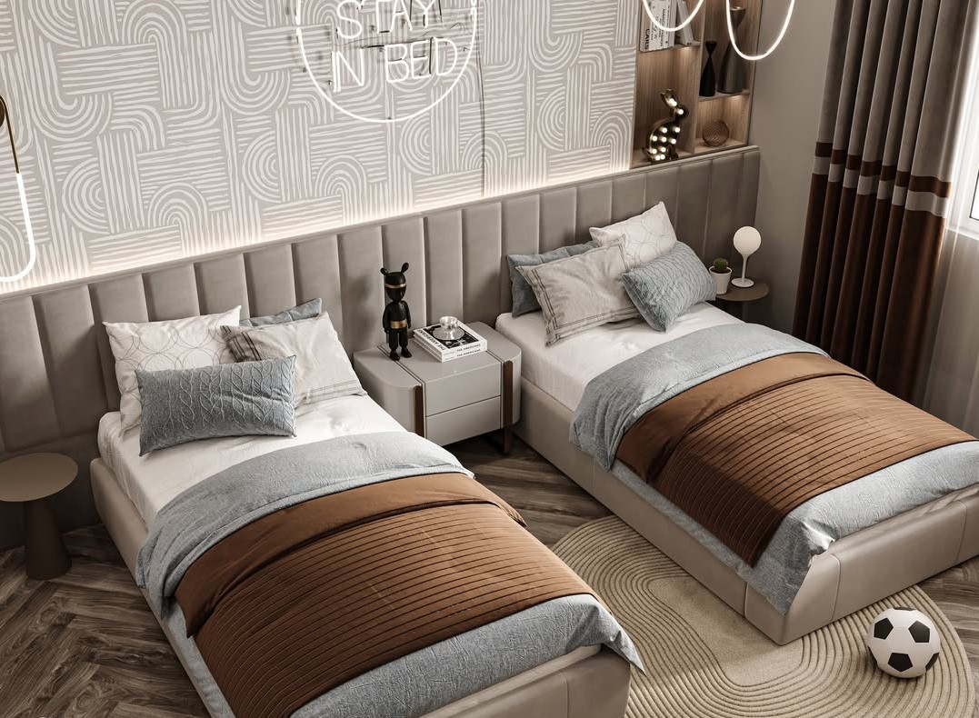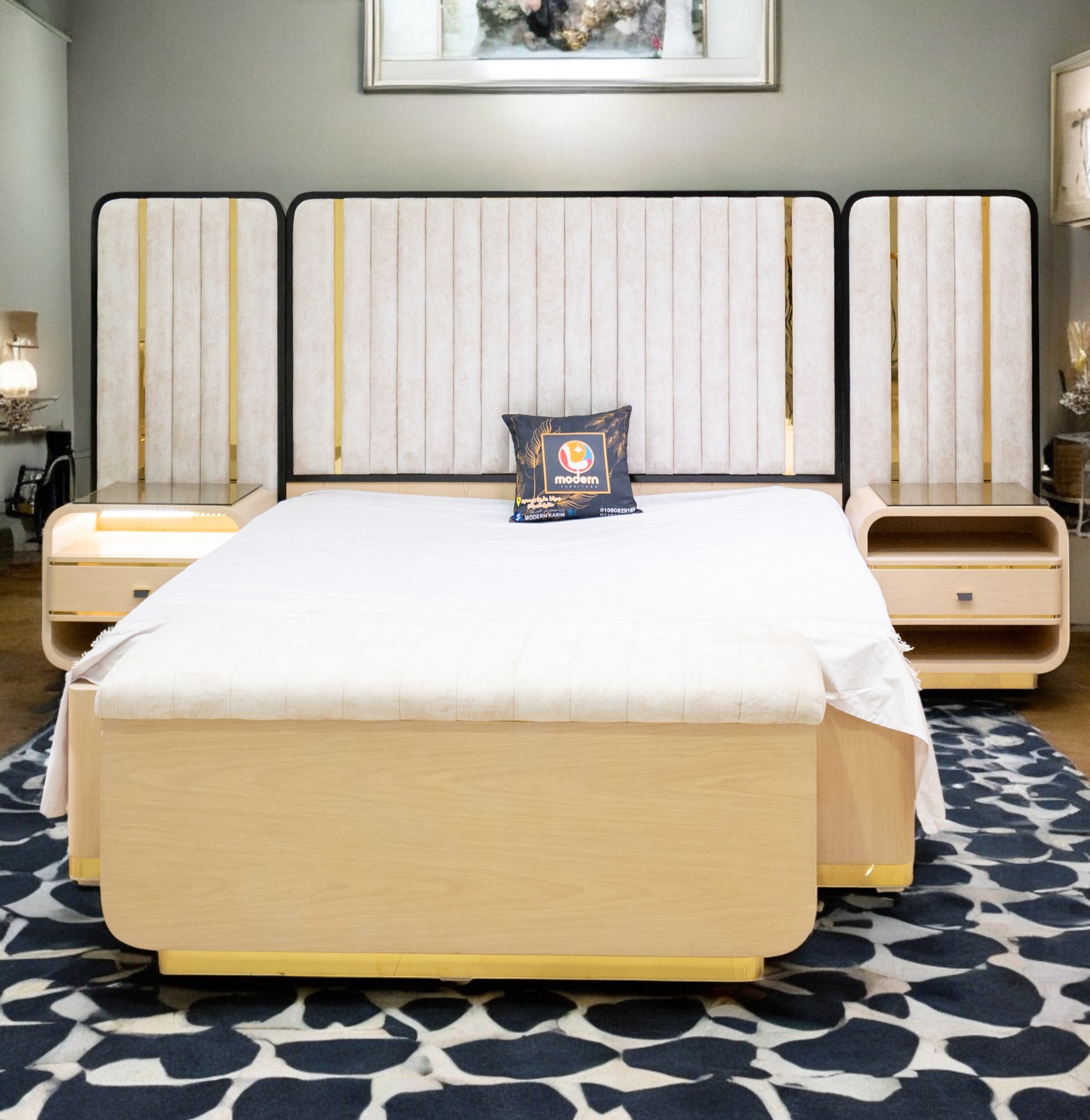 سرير أنيق وعصري يتميز بتصميم فاخر يضفي لمسة من الرقي على غرفة نومك. يمتد اللوح الأمامي الكبير ليغطي جزءاً واسعاً من الجدار، مع تنجيد ناعم وتفاصيل هندسية تضيف طابعاً راقياً وعصرياً. مزود بشريط إضاءة رفيع يمنح أجواء هادئة وأنيقة داخل الغرفة. القاعدة مرتفعة قليلاً عن الأرض، ما يعطي السرير مظهراً خفيفاً مع الحفاظ على المتانة والثبات. مصنوع من خشب طبيعي عالي الجودة مع جلد فاخر، ليجمع بين المتانة والراحة. يجمع التصميم بين الفخامة والوظيفة، بينما يضيف اللون الرمادي الداكن مع الرمادي الفاتح لمسة عصرية تناسب مختلف أنماط الديكور الحديث. هذا السرير العصري هو الخيار المثالي لمن يبحث عن سرير فاخر ومريح لغرفة النوم.