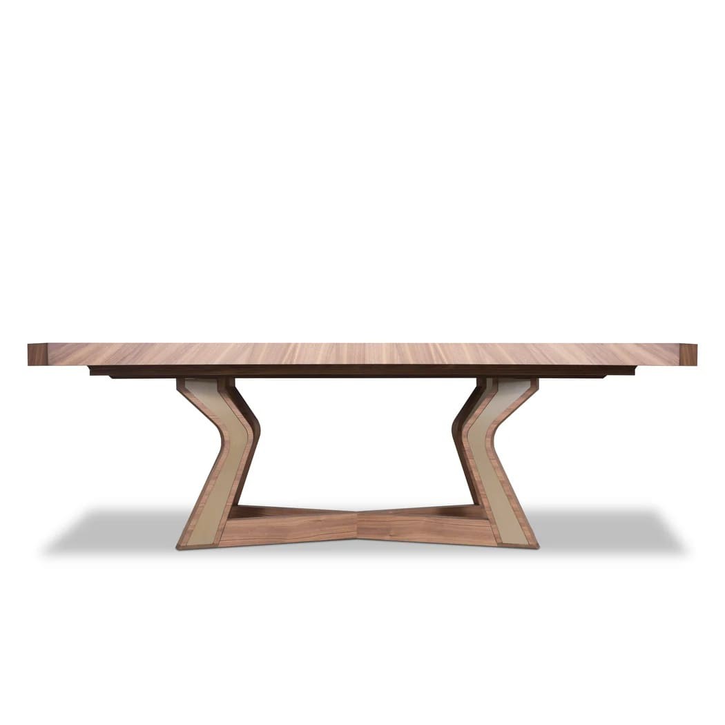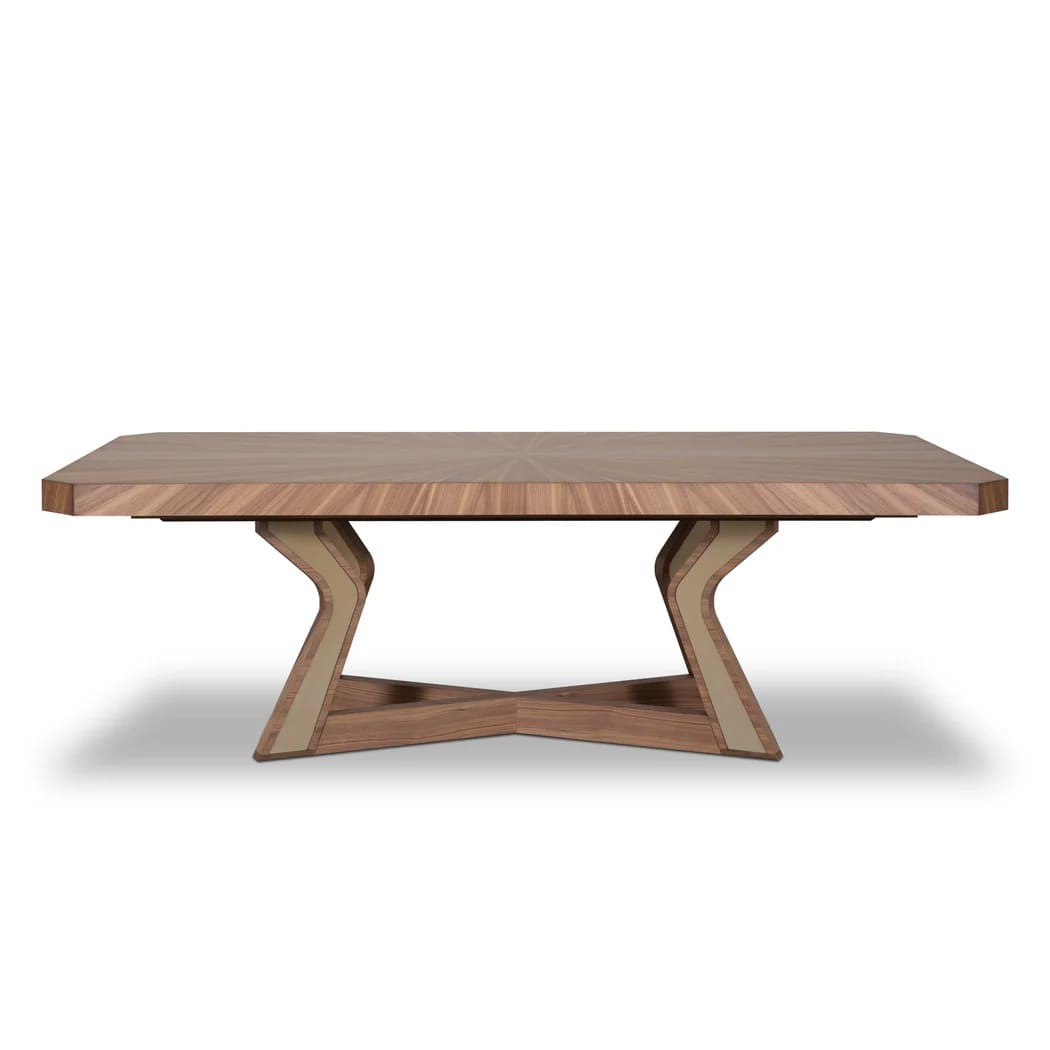 ترابيزة طعام أنيقة مصنوعة من خشب الزان الداكن عالي الجودة، بتصميم مستطيل أنيق مع حواف مشطوفة تضيف لمسة ناعمة وجذابة. تستند على أربعة أرجل متصلة في قاعدة متينة على شكل حرف "X" تمنح الطاولة ثباتًا وقوة استثنائية، مع تصميم منحني ومائل للأرجل يبرز الطابع العصري والراقي.