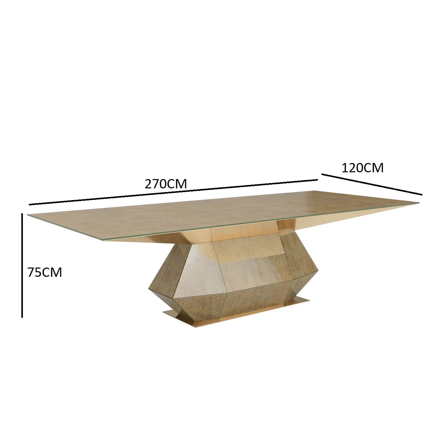 ارتقِ بأناقة غرفة الطعام مع هذه الترابيزة الفاخرة التي تجمع بين البساطة والفخامة. تأتي بتصميم هندسي عصري مميز وأبعاد مثالية (العرض 270 سم × العمق 120 سم × الارتفاع 75 سم)، لتوفر مساحة واسعة ومريحة لاستضافة العائلة والضيوف.