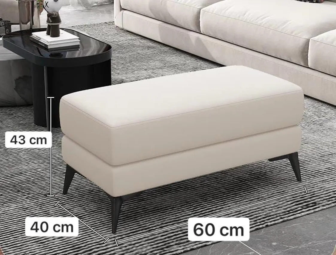 يأتي مع بف مستطيل الشكل، مغطى بقماش بلون مماثل للكرسي، ومزوّد بـ أرجل معدنية سوداء رفيعة تضيف لمسة عصرية أنيقة. تصميمه البسيط يجعله قطعة متعددة الاستخدامات سواء كمسند للقدم أو مقعد إضافي.