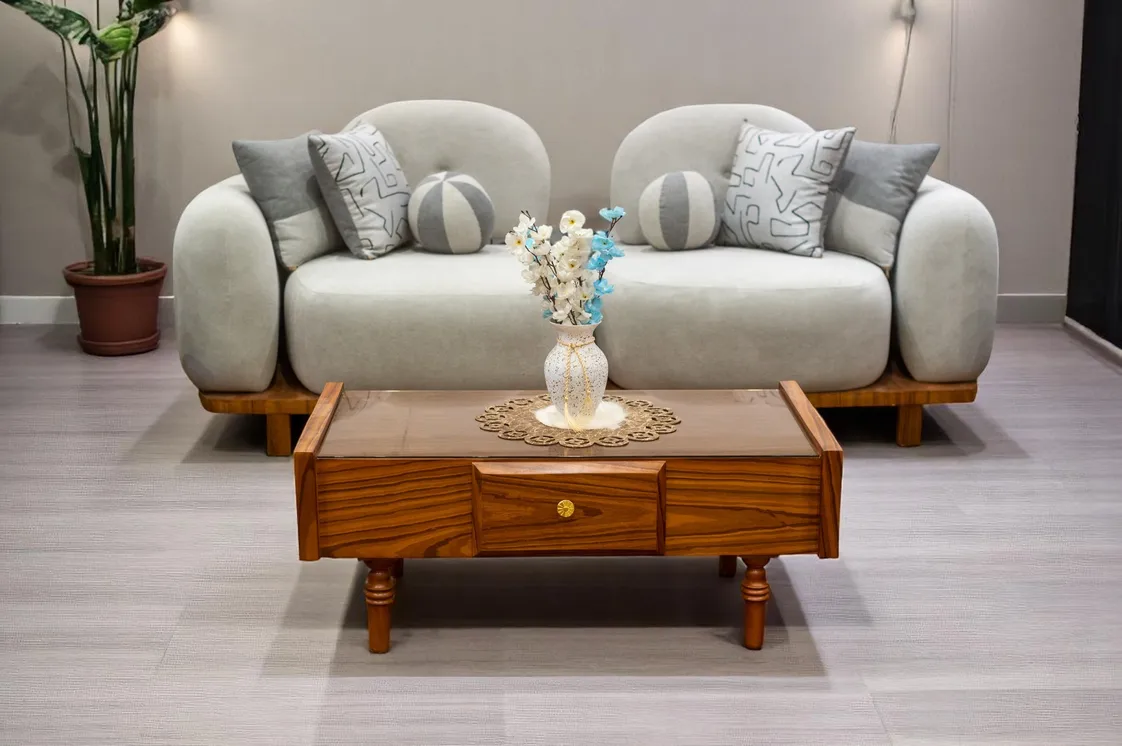 مصنوعة من الخشب مع سطح زجاجي أنيق يعكس الضوء. تحتوي على درج بمنتصفها بمقبض ذهبي لتخزين الأغراض الصغيرة، مع أرجل قصيرة مزخرفة تضيف طابعًا كلاسيكيًا.
