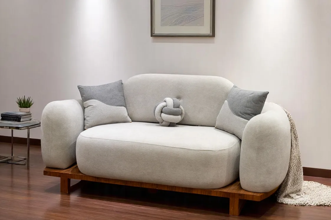 كنبة أنيقة بلون رمادي فاتح تضيف دفئًا وأناقة. تأتي بوسائد بلونين رمادي فاتح وغامق مع وسادة وسطى بتصميم عقدة مميزة. مثبتة على قاعدة خشبية متينة.