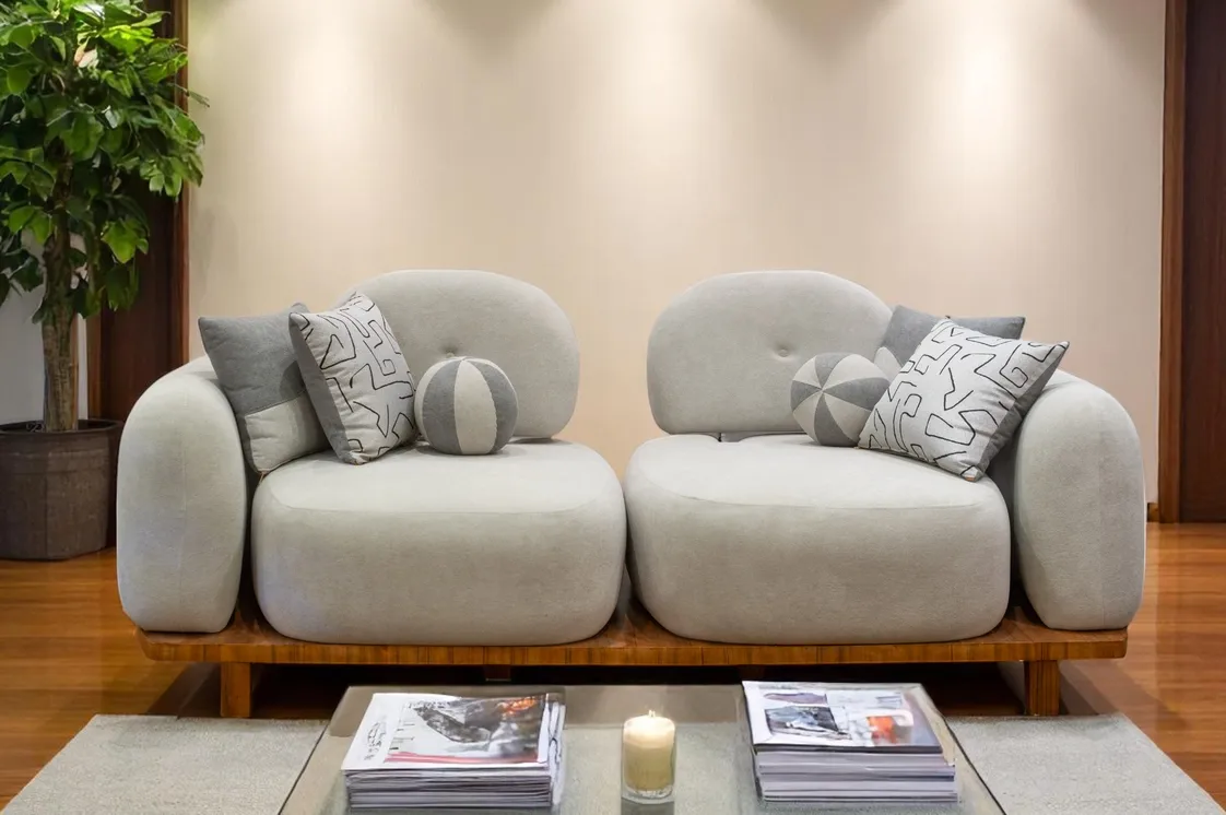 بتصميم دائري أنيق، مكسوة بـ قماش رمادي فاتح يضفي الراحة والرقي. مزينة بوسائد هندسية ووسادتين صغيرتين مستديرتين لانسجام بصري أنيق. مثبتة على قاعدة خشبية متينة، وتعد واسعة ومثالية للجلسات العائلية.