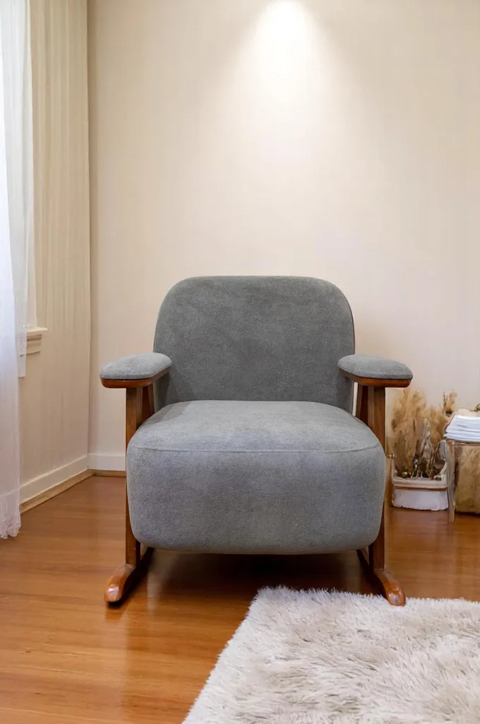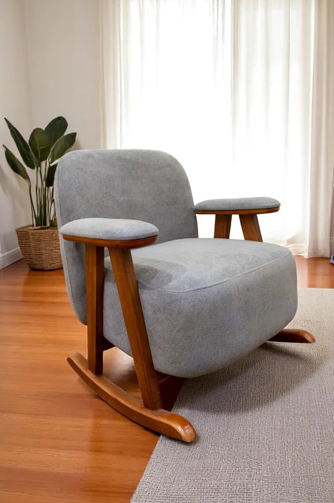 كرسيان هزازان أنيقان بلون رمادي داكن، مصنوعان من الخشب الطبيعي ومغطّيان بـ قماش ناعم. مزودان بمساند مبطنة للذراعين وقاعدة خشبية منحنية تمنح حركة هادئة وانسيابية. تصميمهما يجمع بين الراحة والطابع العصري.