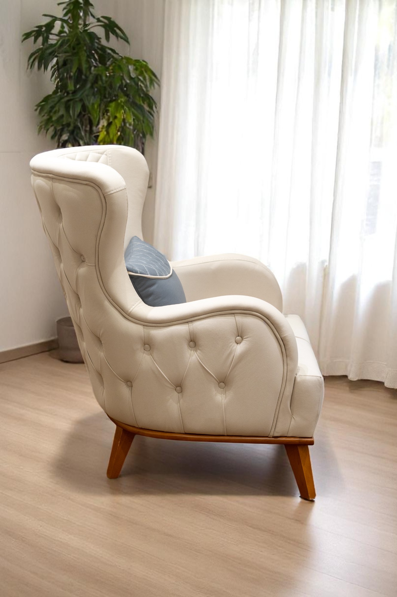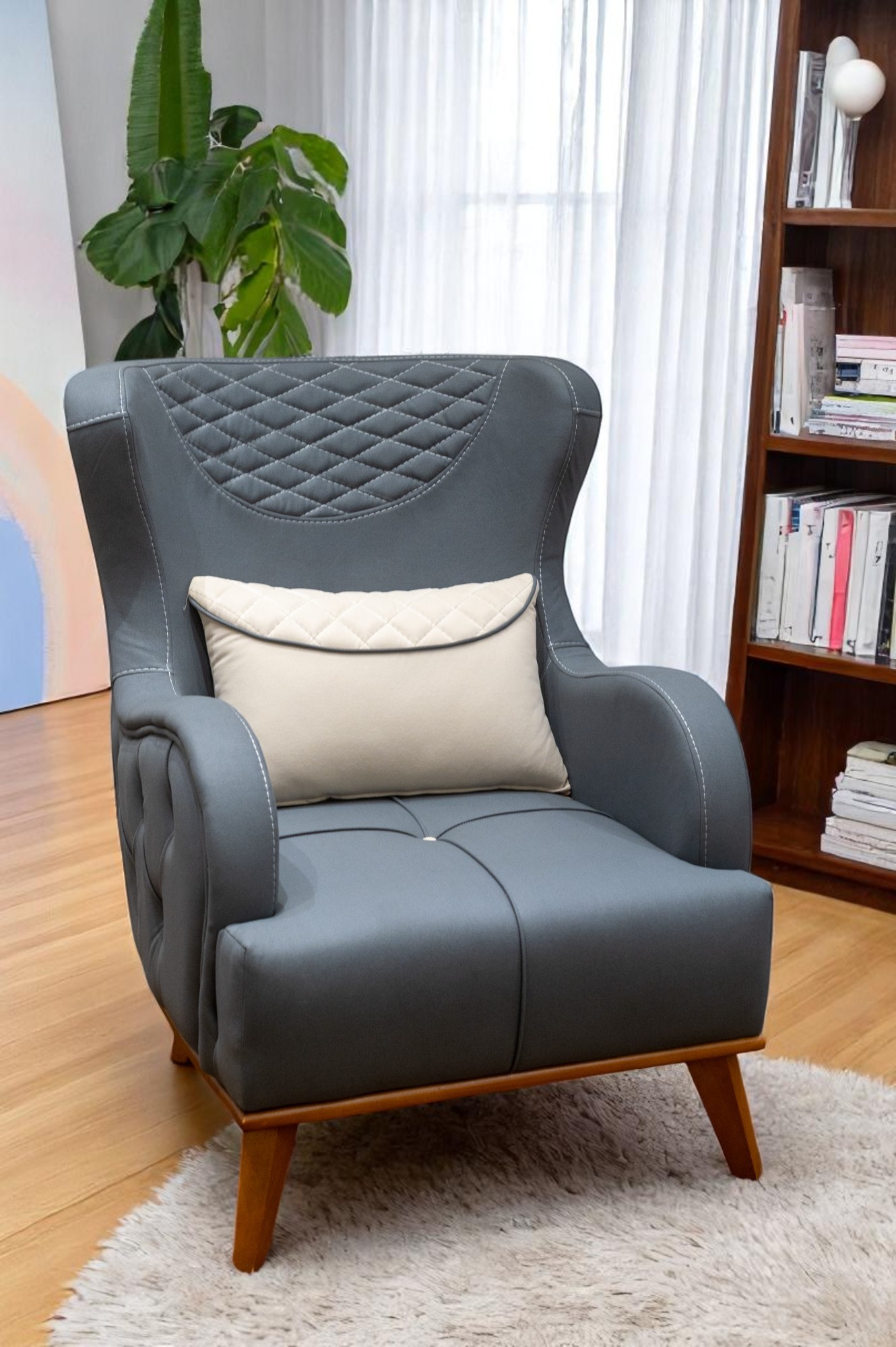 كرسي مريح بتصميم عصري، يأتي بلون أبيض فاتح أو بلون رمادي داكن، مع تفاصيل مبطنة على الظهر والأذرع لزيادة الراحة. الفوتيه يحتوي على وسادة صغيرة بنقوش متقاطعة باللون الرمادي، مما يضيف لمسة جمالية راقية. الأرجل الخشبية تمنح الفوتيه طابعًا دافئًا يتناغم مع التصميم العصري.