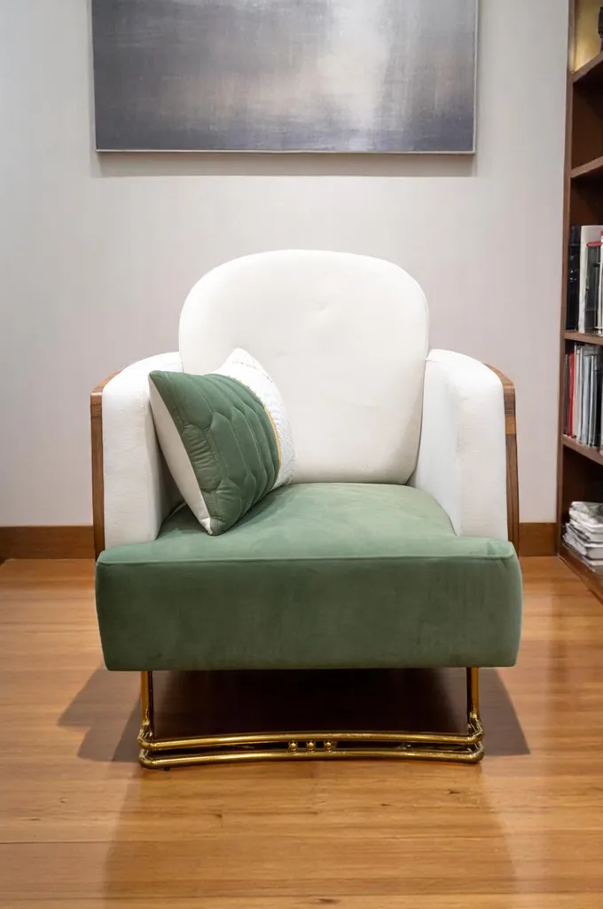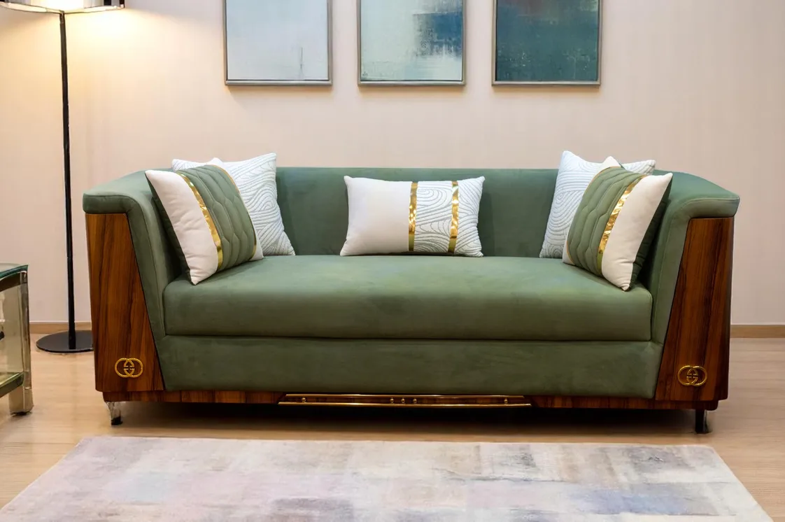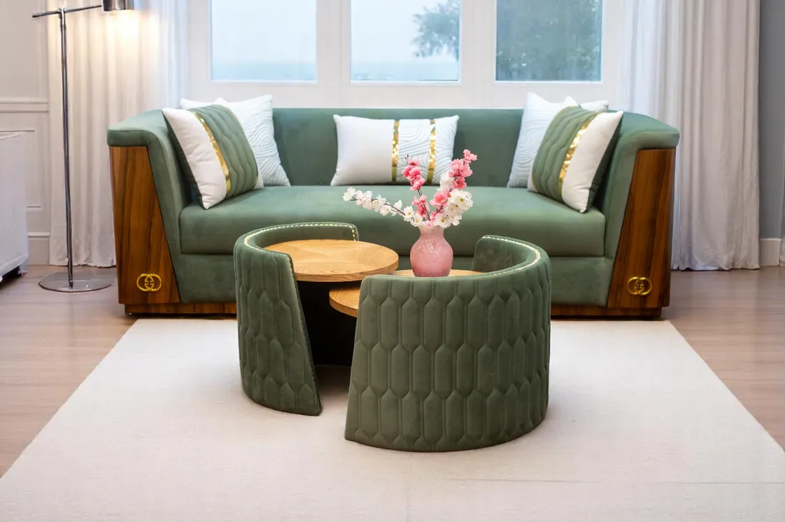 أضف لمسة من الرقي والفخامة إلى منزلك مع هذا الانتريه المودرن الفاخر، المصمم بعناية ليجمع بين الأناقة والعملية. يتكون الطقم من كنبة ثلاثية المقعد، كنبة ثنائية، عدد 2 فوتيه بتصميم راقٍ، وترابيزة قهوة مبتكرة بتصميم مزدوج مميز. يتميز التصميم بمزيج متناسق بين اللون الأخضر الهادئ والتفاصيل الخشبية الفاخرة، ما يضفي طابعًا دافئًا ومميزًا على أي مساحة معيشة.