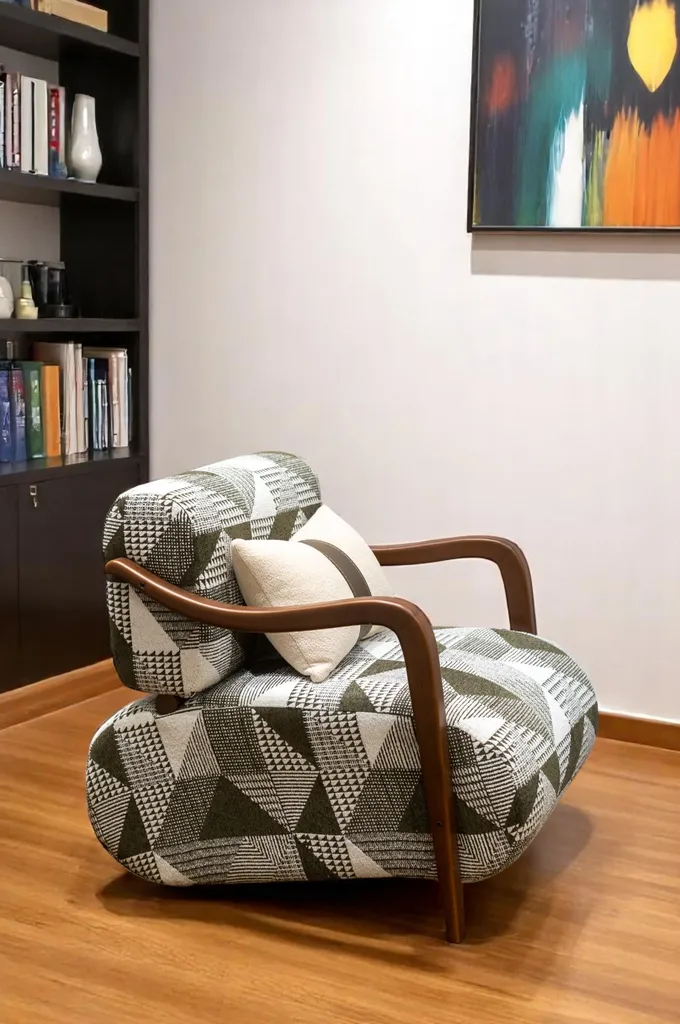 كنبة مميزة بتصميم عصري مزوّدة بأذرع خشبية بنية تضيف لمسة دفء وتناسق. يغطي القماش المقعد والظهر بنمط هندسي مبتكر من مثلثات بألوان الأبيض والرمادي والأخضر، مما يضفي حيوية وأناقة للمكان. تتوسط الكنبة وسادة مستطيلة بيضاء يزينها شريط داكن يمنح التصميم لمسة فخمة ودعماً إضافياً للجلوس المريح.