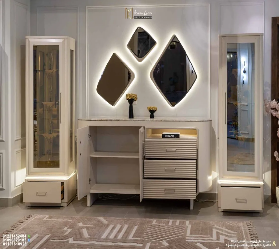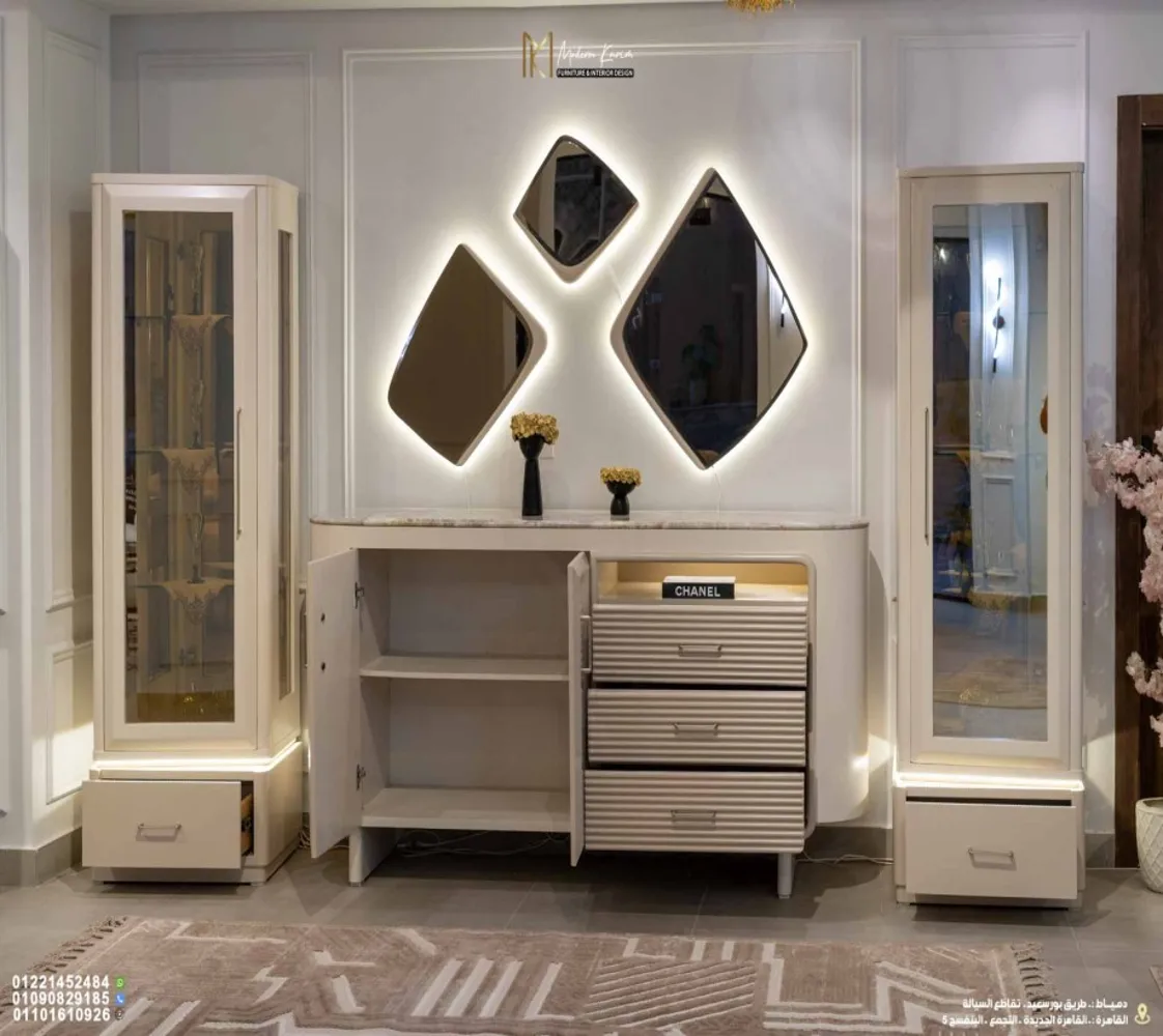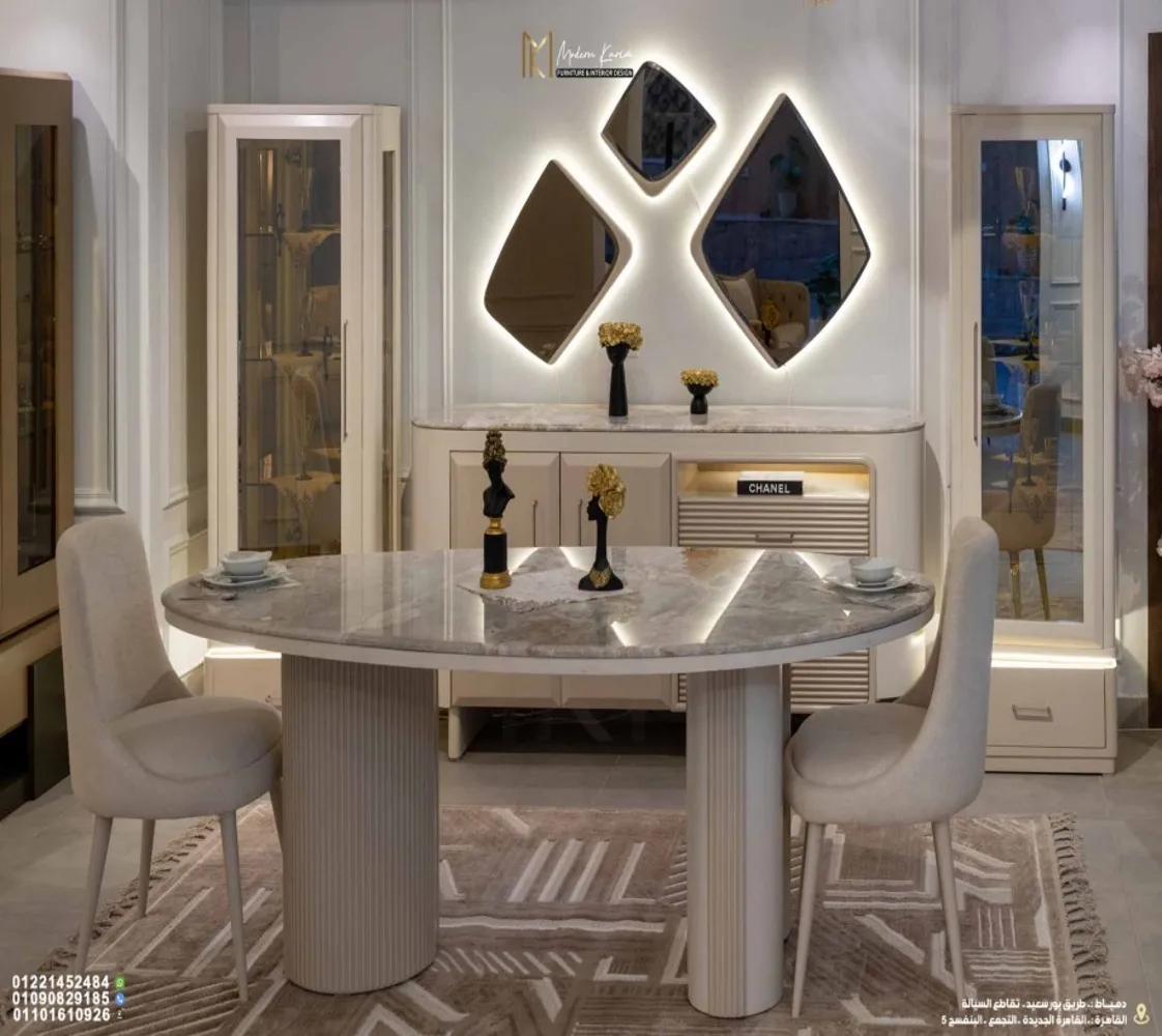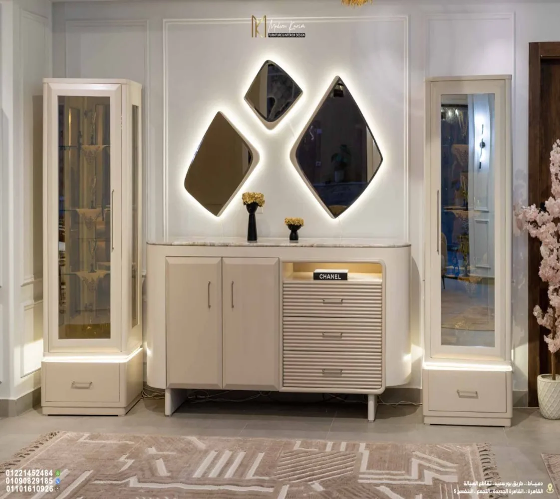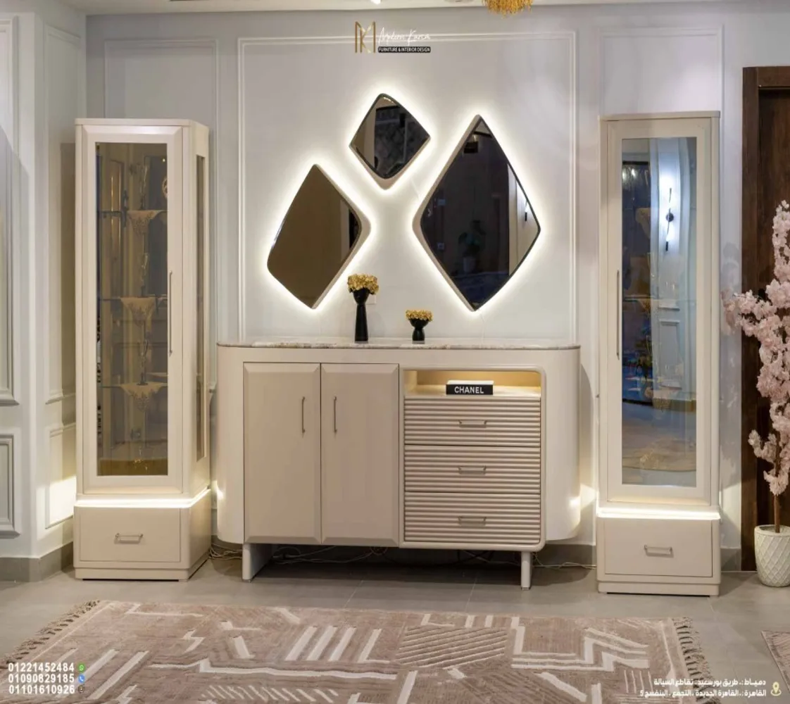 🪞 مرايات مودرن: تعكس الإضاءة وتضيف إحساس بالاتساع واللمعان في المكان.