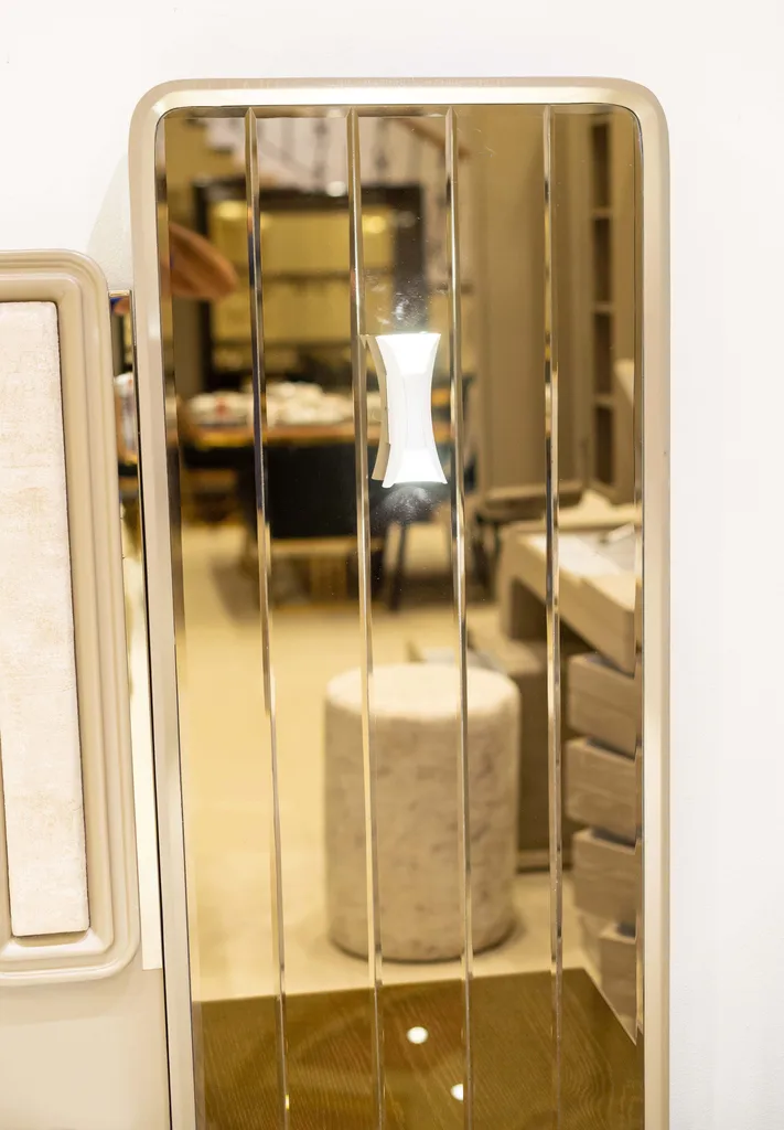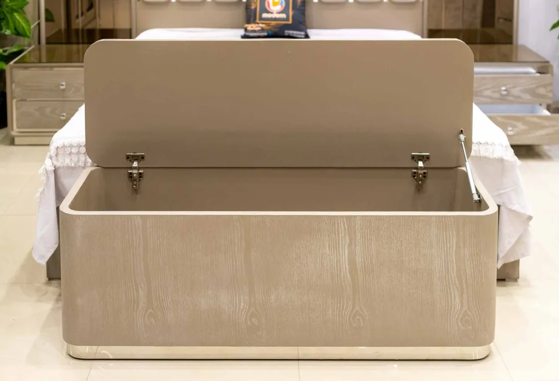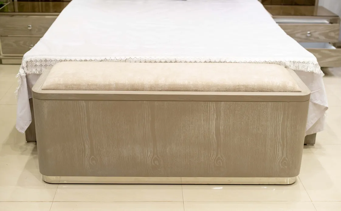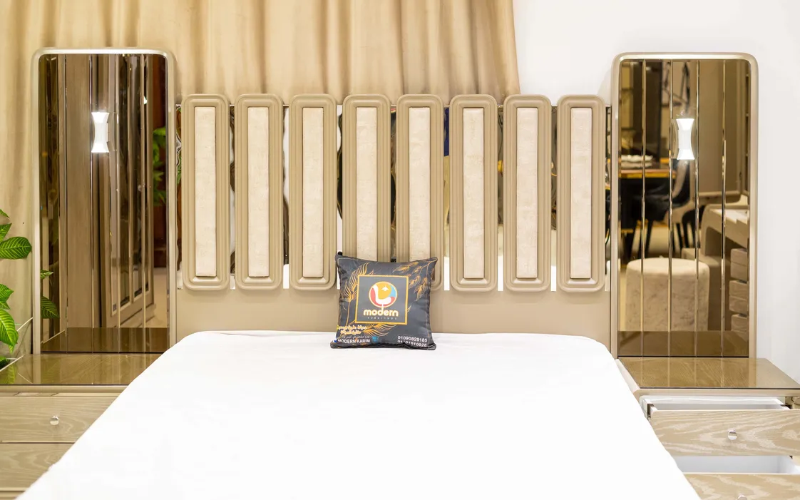 احصل على توازن مثالي بين الأناقة والبساطة مع هذا الطقم العصري لغرفة النوم، الذي يتميز بسرير مميز برأس يتكون من ألواح خشبية مستطيلة متوازية بلون بيج فاتح، تضفي طابعًا هندسيًا راقيًا. تتخلل التصميم تفاصيل معدنية ومرايا عاكسة على الجانبين، تضيف لمسة فخامة وانسجام بصري. قاعدة السرير منخفضة قليلاً لتعزيز الشعور بالراحة والثبات.