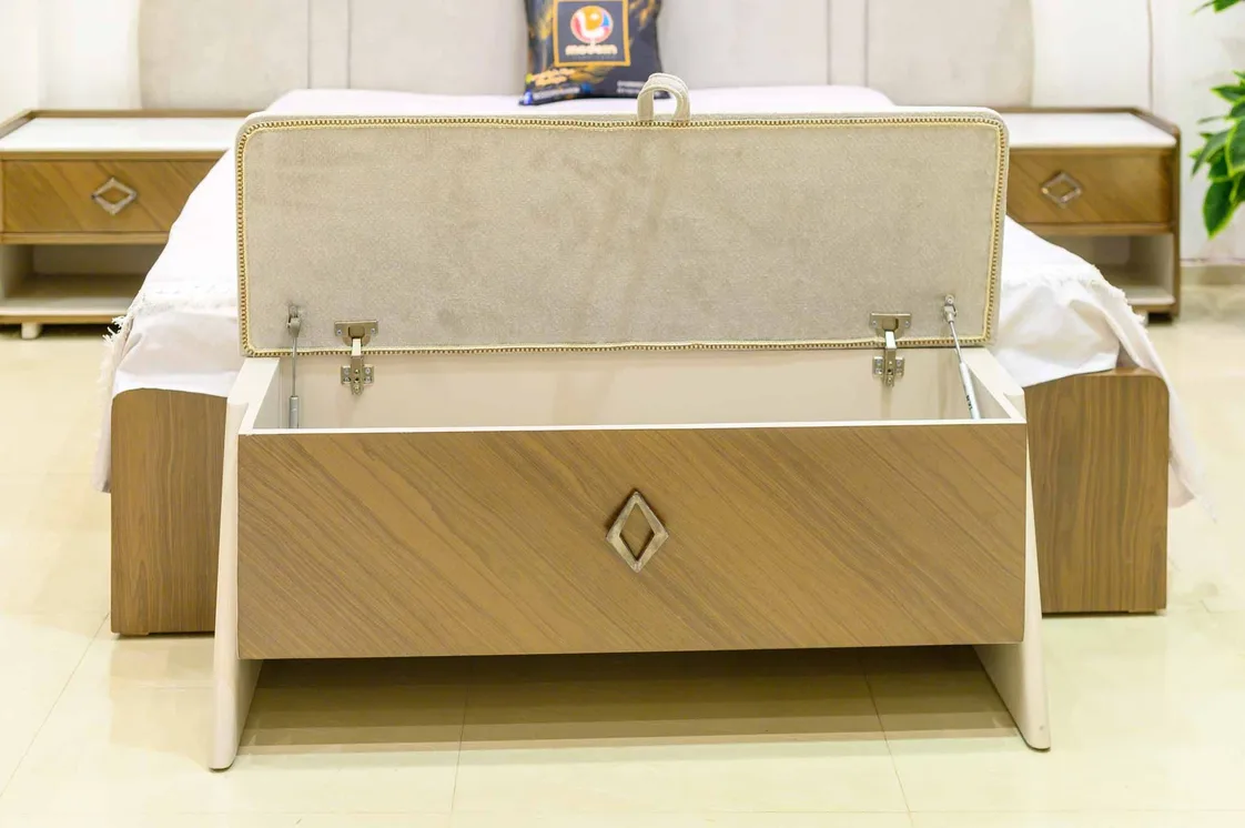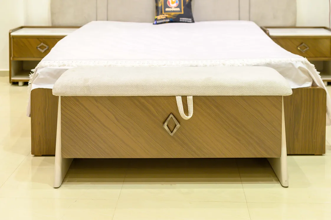 أضف لمسة من الفخامة العصرية إلى غرفة نومك مع هذا الطقم الأنيق المتكامل. يتميز السرير بتصميم فاخر مع لوح خلفي مقوس مبطن بأناقة، يضفي طابعًا هادئًا ومتوازنًا على المساحة. تأتي الطاولة الجانبية (الكومود) بتصميم أنيق يجمع بين الشكل العملي والزخارف العصرية، مع درجين بتفاصيل هندسية مميزة ومساحة تخزين مفتوحة. ويكتمل الطقم ببانكيت أمامي أنيق يوفر لمسة ديكورية إضافية ويعزز من وظائف الغرفة.
