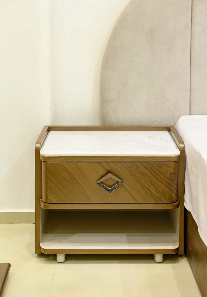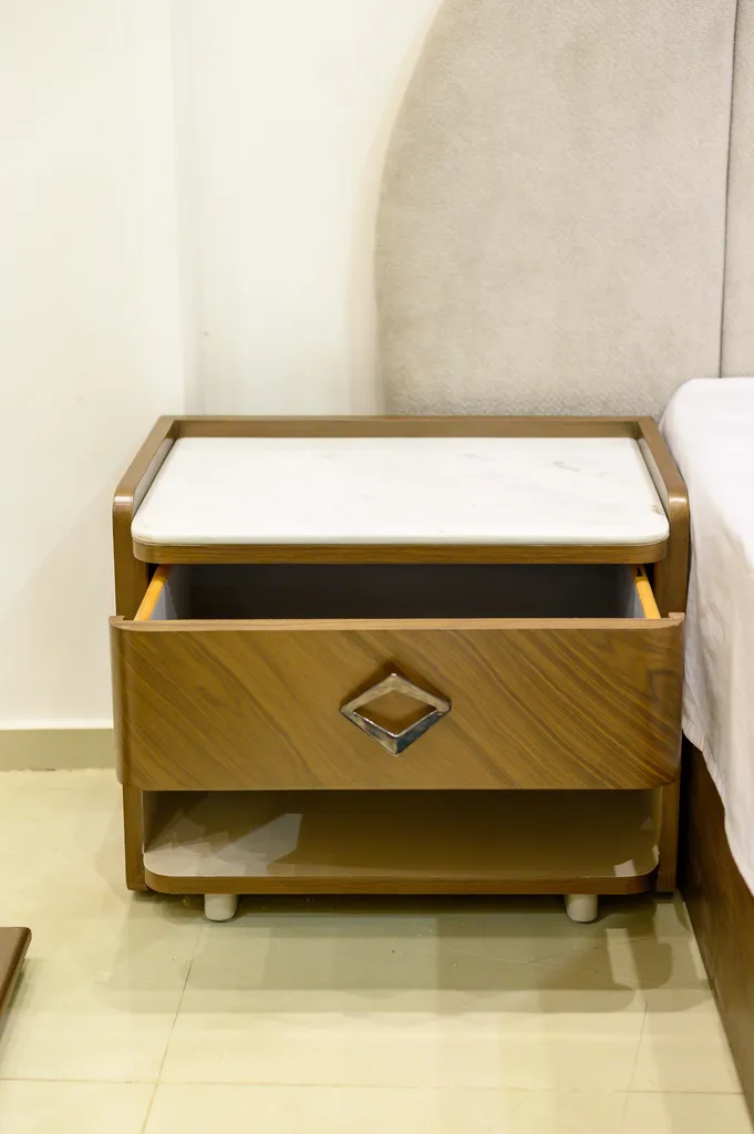 كومود بجوانب السرير بلمسات هندسية وأدراج تخزين عملية.