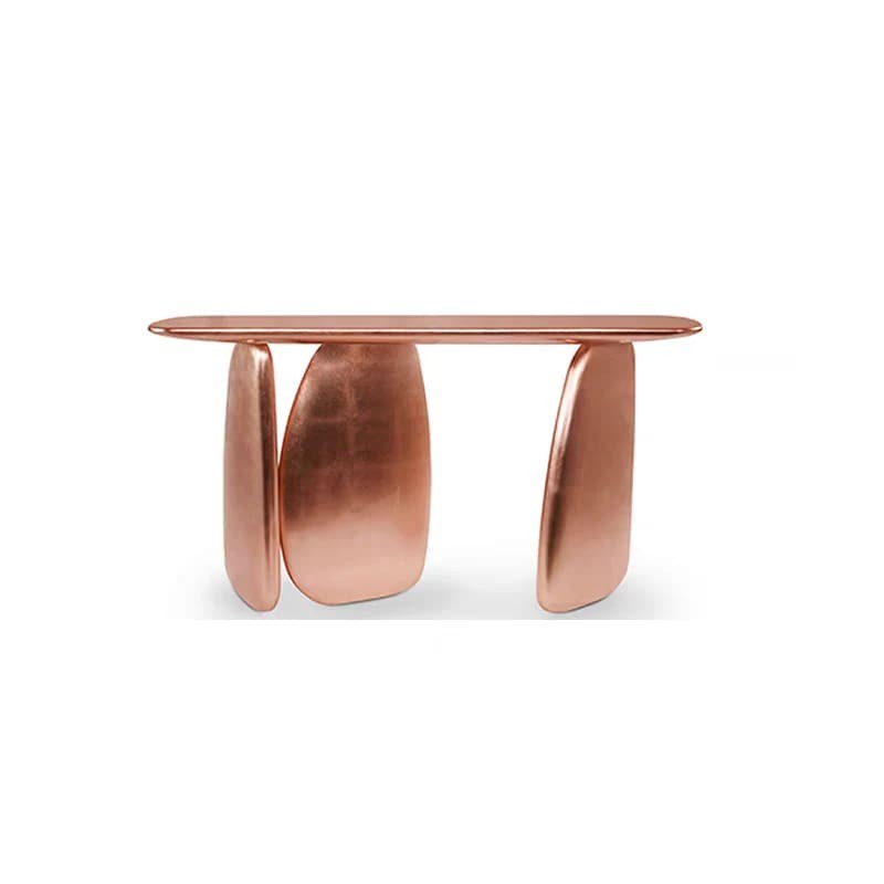 ما يميز هذا الكونسول هو تصميم الأرجل غير المتناظرة التي تشبه الألواح المنحنية، مما يخلق مظهرًا فنيًا فريدًا يلفت الأنظار. يجمع بين اللونين الأسود والذهبي ليضفي إحساسًا بالدفء والرقي، ويتناغم بسهولة مع أنماط الديكور الحديثة والفاخرة.