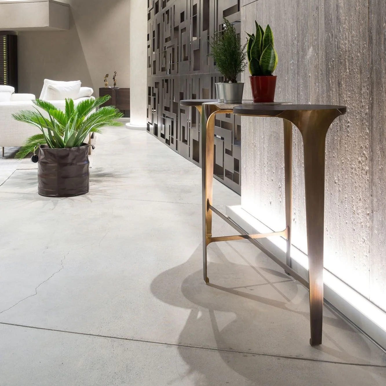 يجمع هذا الكونسول الفاخر والبسيط بين الأناقة والعملية، مما يجعله قطعة مثالية للمداخل أو خلف الأرائك. يتميز بسطح علوي طويل ورفيع بتصميم رخامي فاخر يمنح لمسة راقية ولمعانًا أنيقًا يضفي عمقًا بصريًا على المساحة.