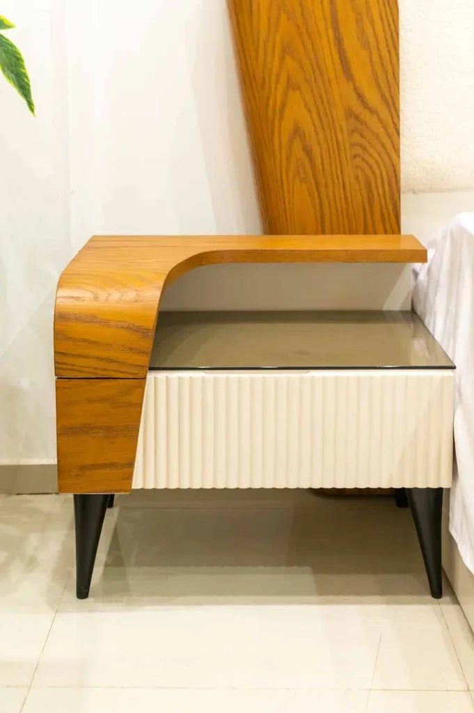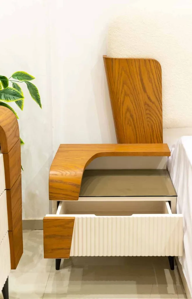 يتضمن الطقم اثنين من الكومود العصرية، كل منهما يتميز بتصميم عملي يجمع بين سطح خشبي بلون بني ودرج بلون أبيض أنيق، بالإضافة إلى مساحة تخزين مفتوحة تناسب الاستخدام اليومي.