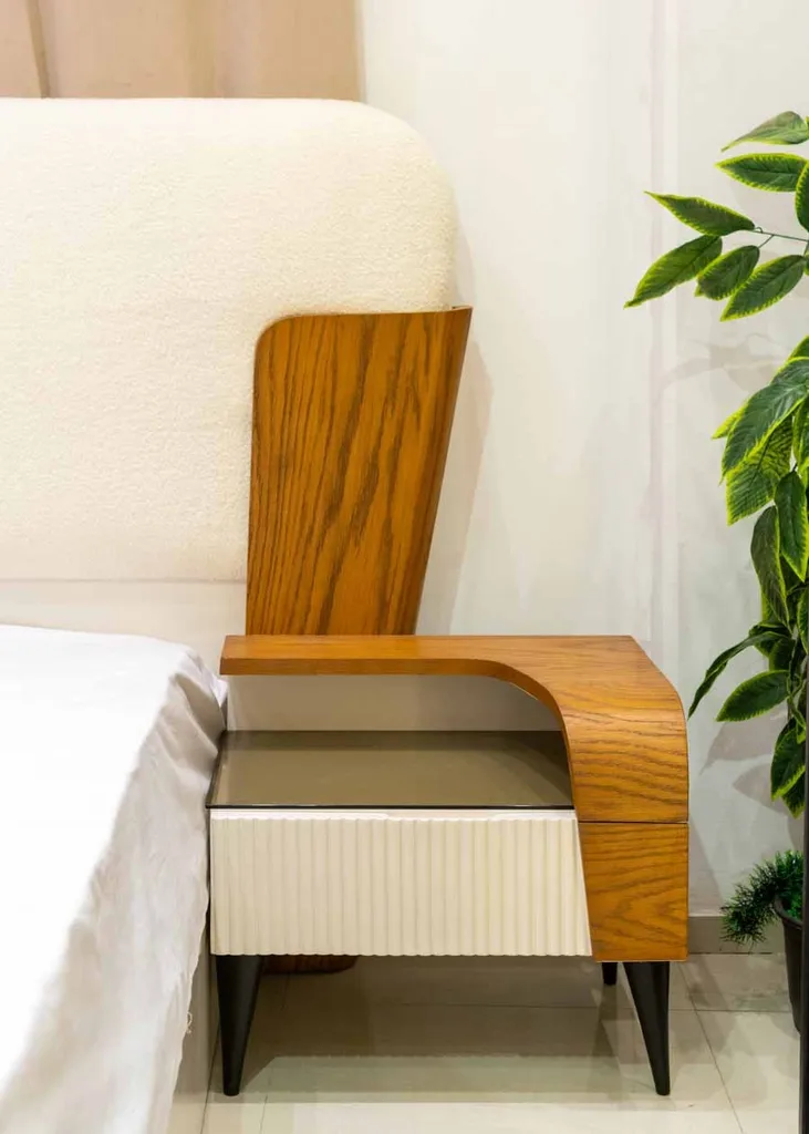 يتميز هذا الطقم الأنيق لغرفة النوم بتوازن مثالي بين الدفء الطبيعي للأخشاب والأناقة العصرية للتصميم.