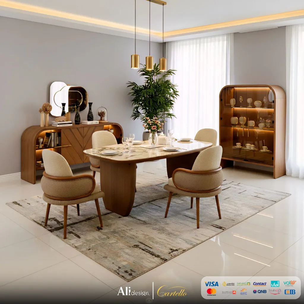 يجمع طقم السفرة هذا بين الفخامة والعملية بتصميم عصري متكامل. الطاولة مستطيلة ذات حواف مستديرة، وسطح من الرخام يمنحها لمسة راقية، بينما ترتكز على قاعدة خشبية بلون رمادي داكن بتصميم منحني أنيق يعزز الثبات والانسيابية.