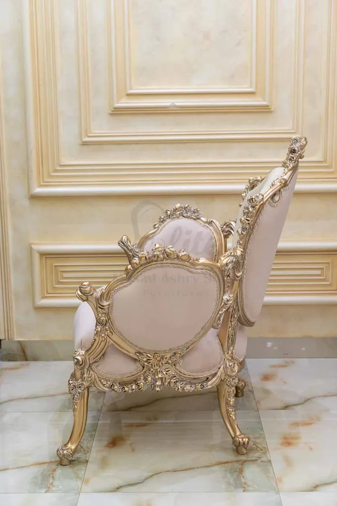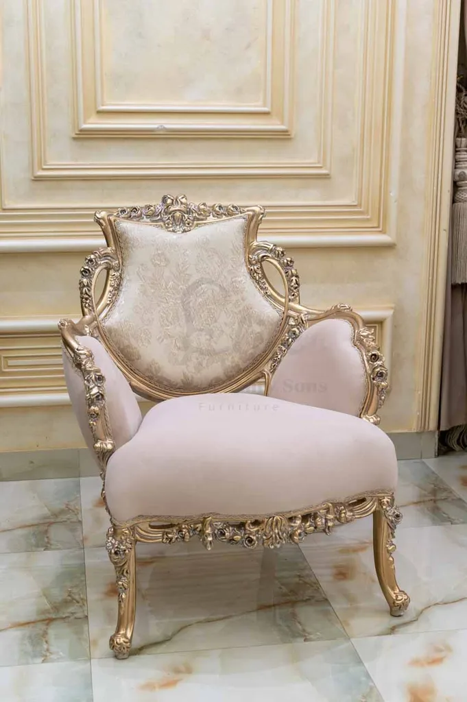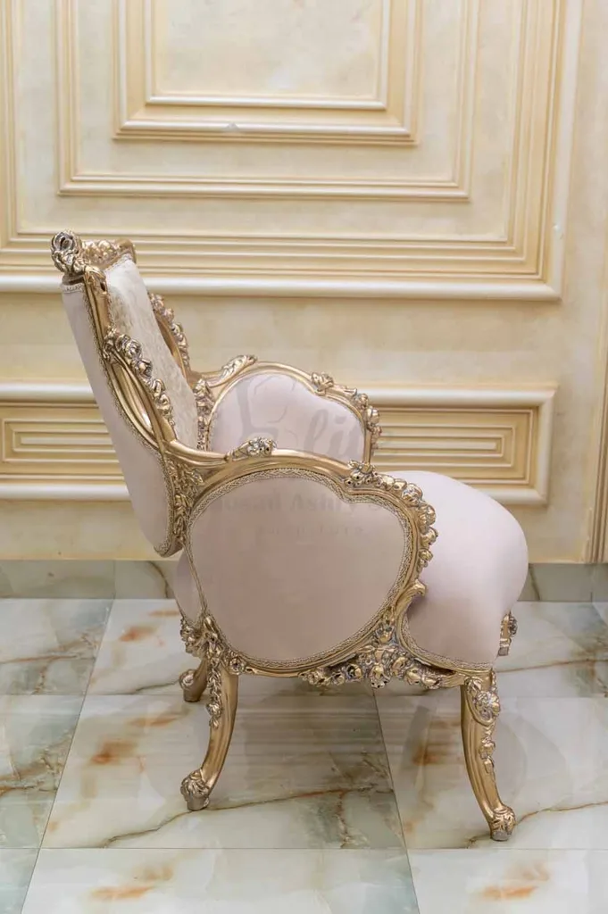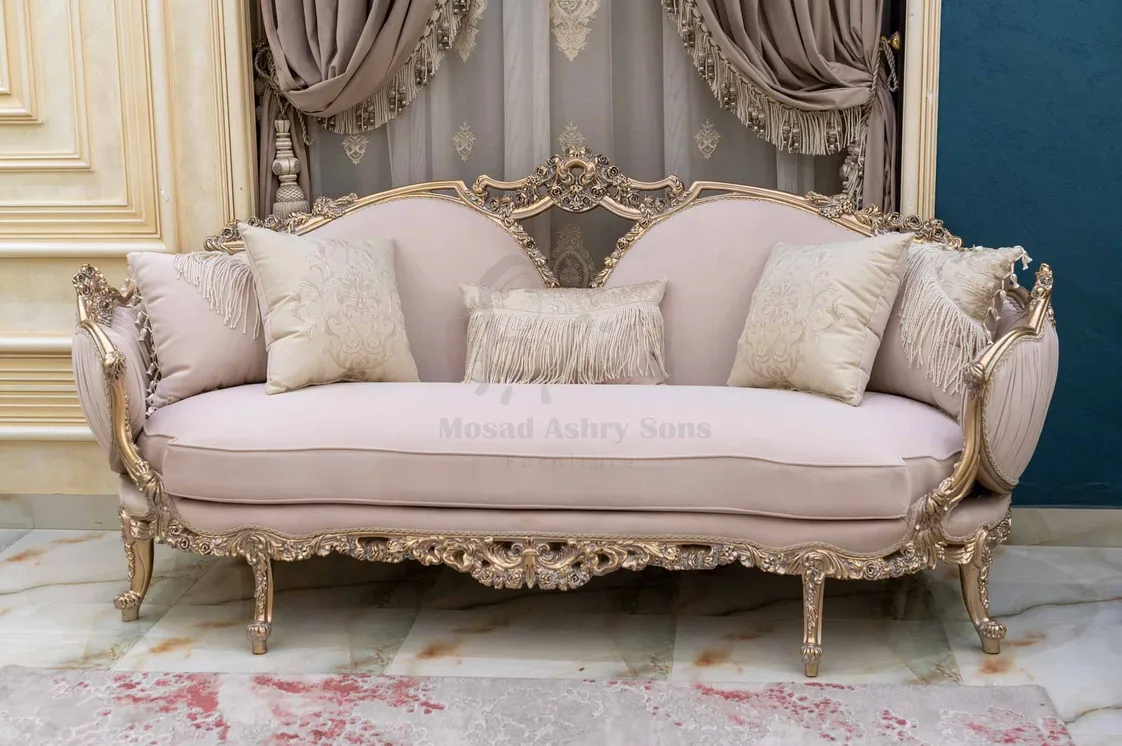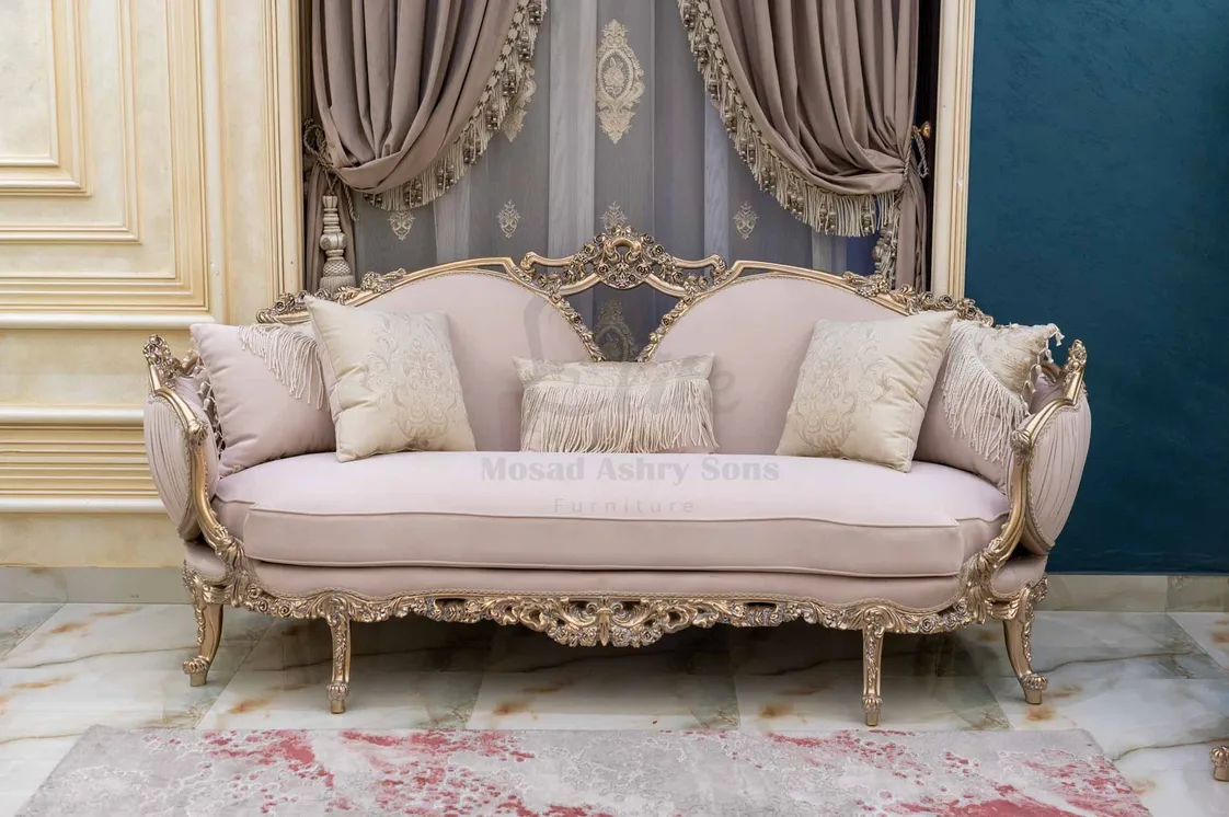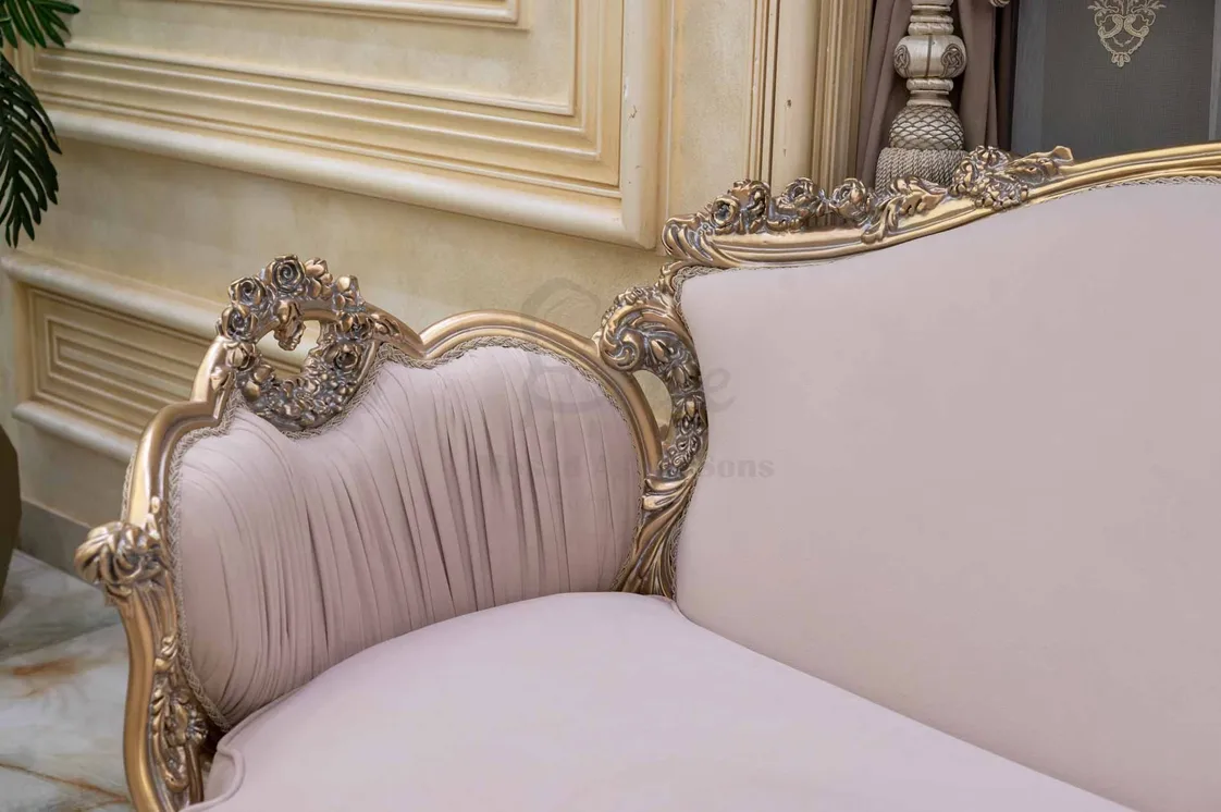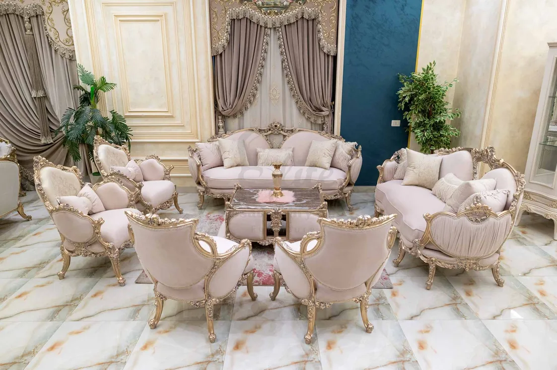 طقم صالون كلاسيكي فاخر بتصميم راقٍ يجمع بين الفخامة والتناسق، مثالي لديكور غرفة المعيشة الراقية. الأرائك والكراسي مغطاة بقماش وردي فاتح وبيج هادئ يضفي أناقة وراحة لا مثيل لها. الإطارات الذهبية المزخرفة تضيف لمسة ملكية فريدة وتعزز جمال التصميم الداخلي. يتكون الطقم من أريكة 3 مقاعد، أريكة 2 مقعد، فوتيهين، و2 شيفيز، مرتبة بشكل متوازن لتحقيق أقصى درجات الراحة. طاولة القهوة المستطيلة بسطح رخامي تزيد من فخامة غرفة الجلوس وتعزز تميز أثاث الصالون. الوسائد المتناسقة مع ألوان القماش تكمل الطقم بلمسة دافئة وجذابة. مثالي لمن يبحث عن أثاث صالون كلاسيكي فاخر وأنيق.