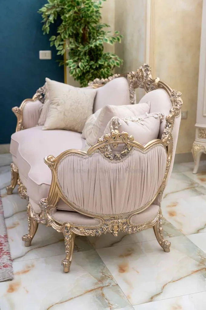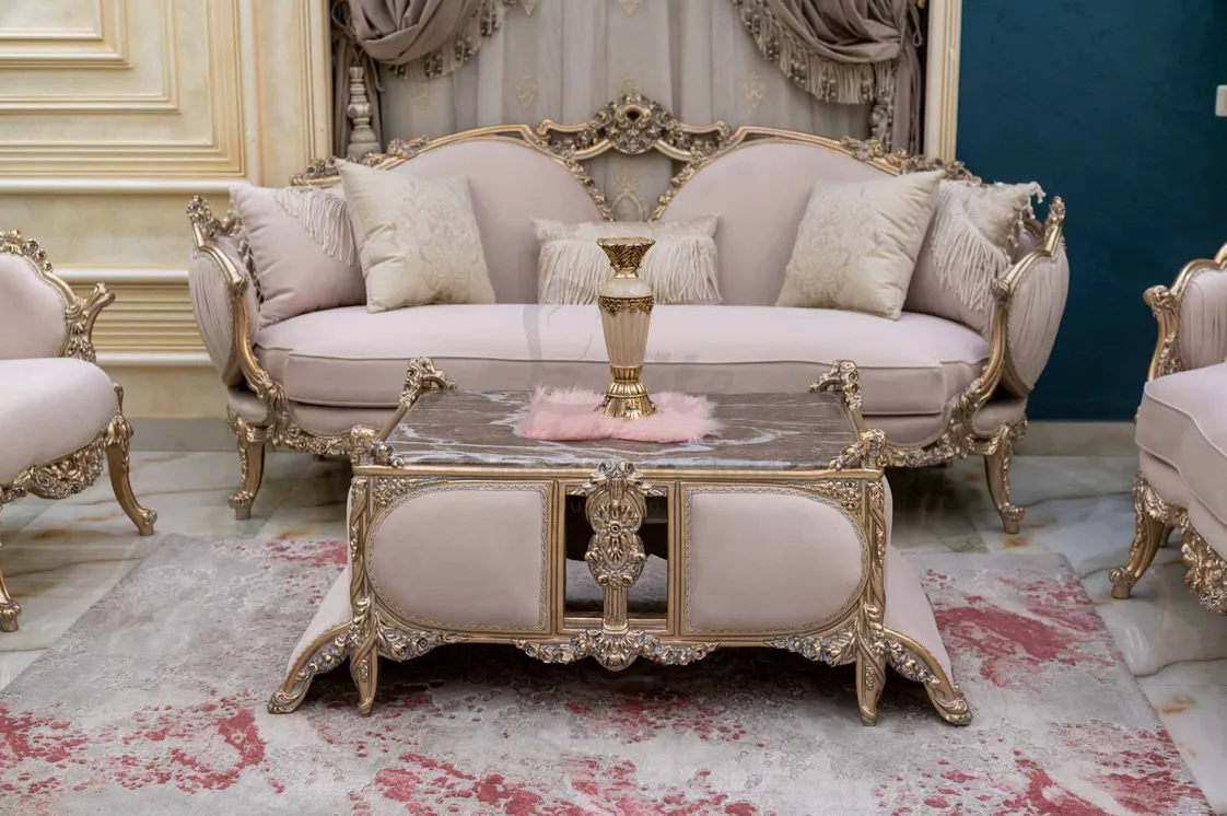 طقم صالون كلاسيكي فاخر بألوان وردي وبيج مع طاولة قهوة رخامية