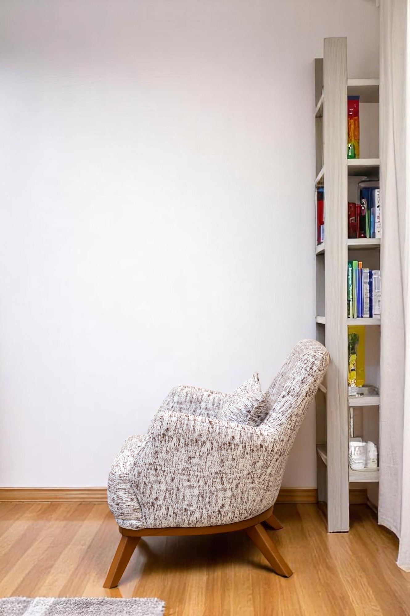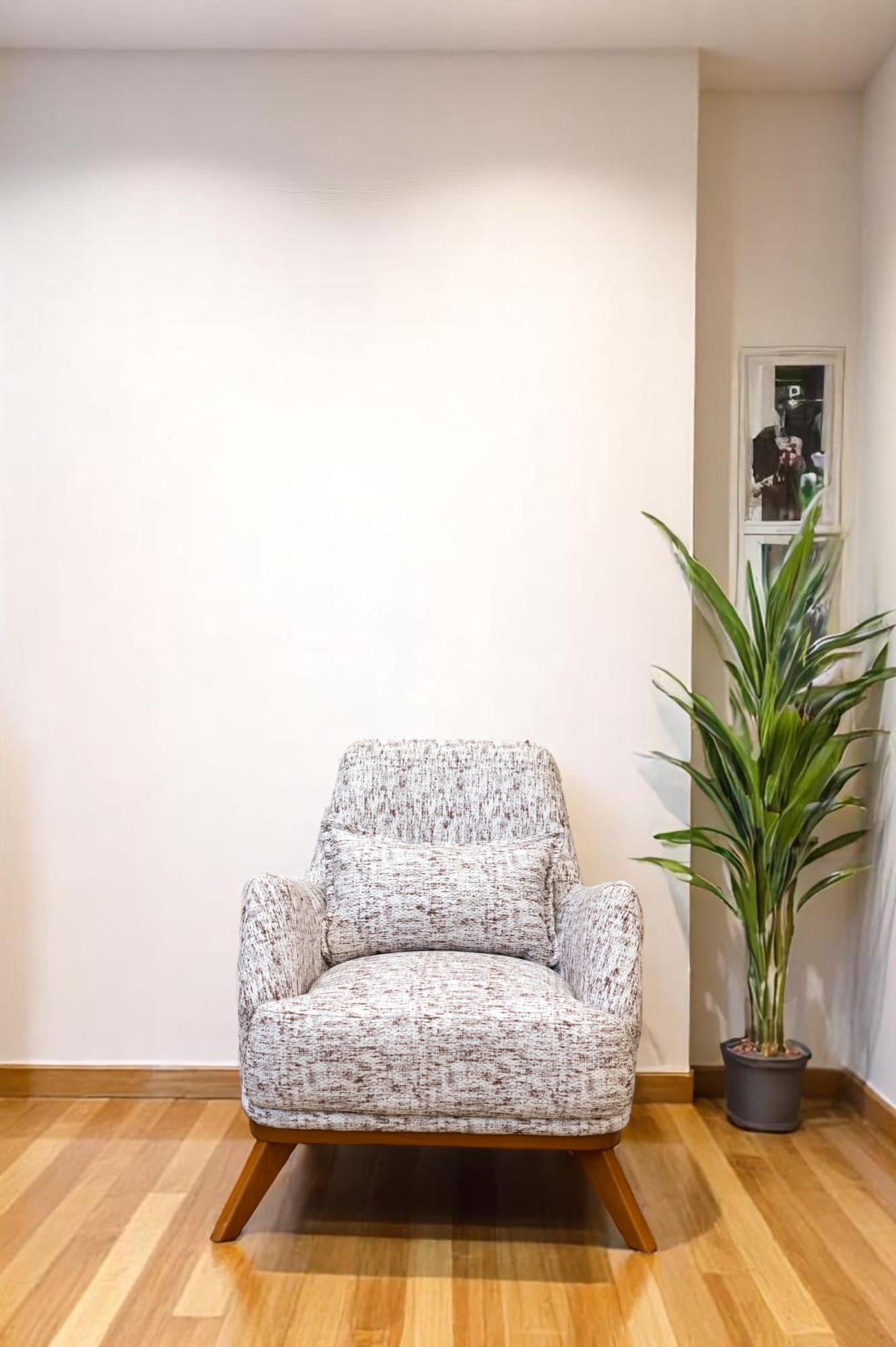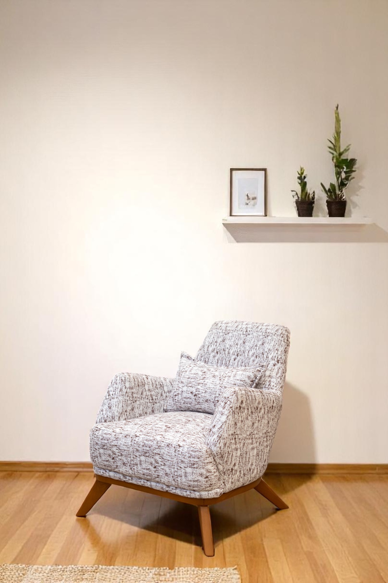 أضف لمسة من الرقي والراحة إلى مساحتك مع هذه الكنبة المفردة المصممة بأسلوب ناعم ومنحني يعكس الذوق العصري. تأتي بتنجيد قماشي بنقشة ناعمة باللون البيج يعزز الإحساس بالدفء والراحة، مع قاعدة خشبية صلبة تضفي ثباتًا وأناقة طبيعية. مثالية لغرف الجلوس، الزوايا الدافئة، أو مداخل المنزل.