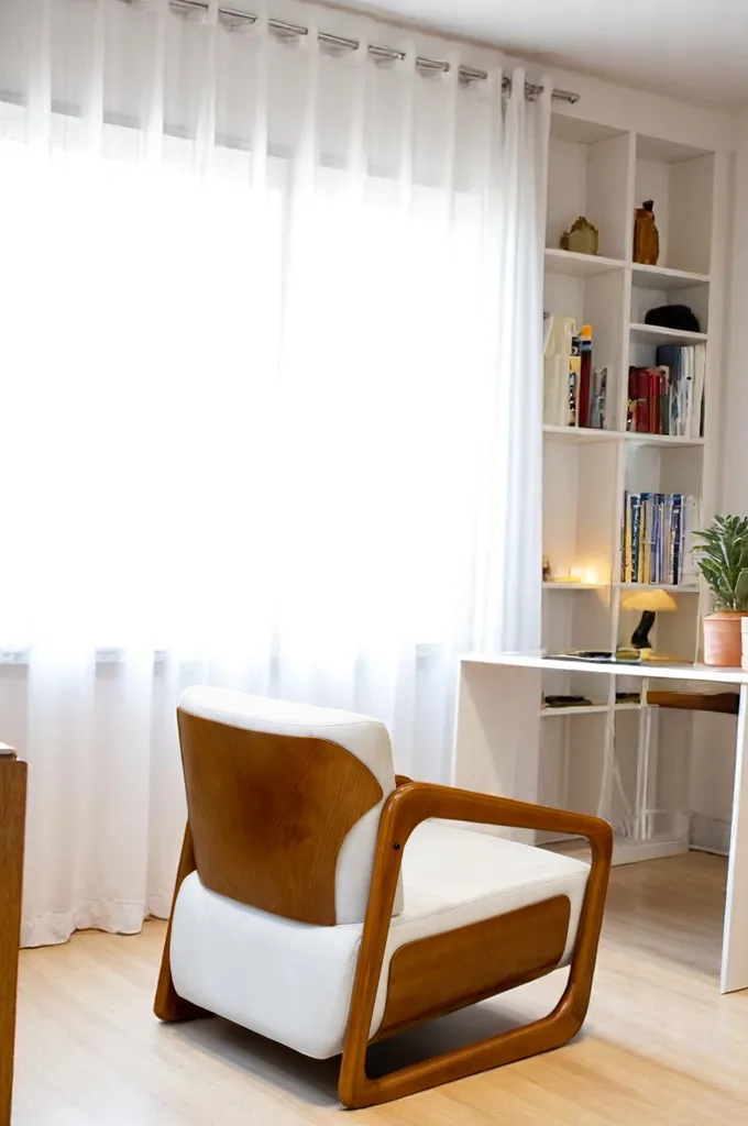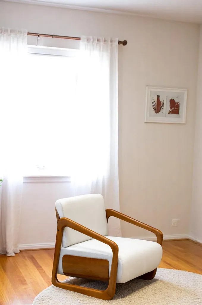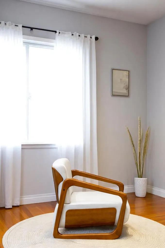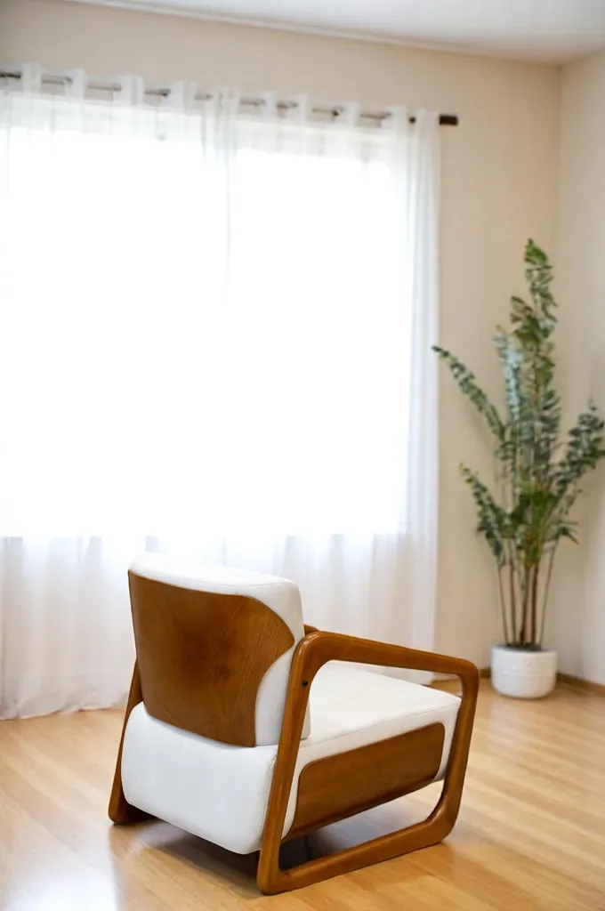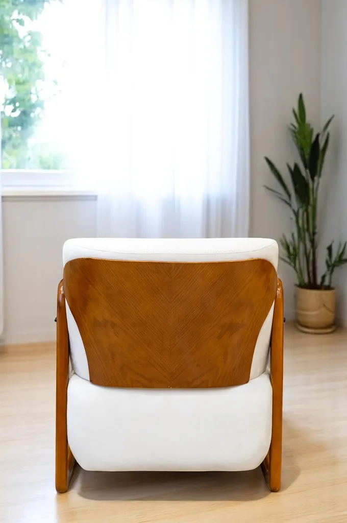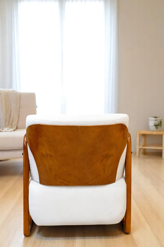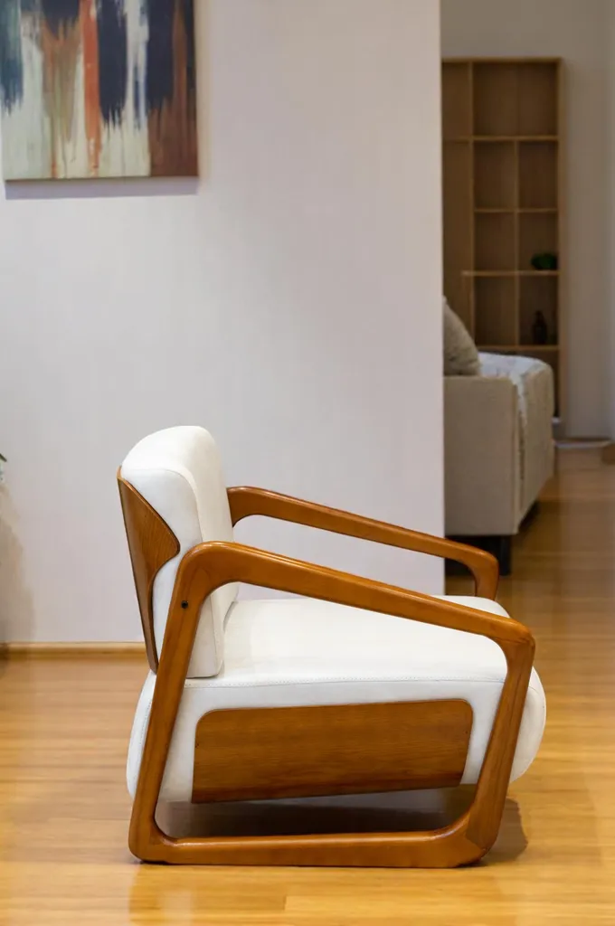 تجمع هذه الكنبة بين دفء الخشب الطبيعي وأناقة التصميم العصري، حيث يأتي الإطار الخشبي المصقول بلون بني فاتح ليبرز جمال الخشب الطبيعي بتفاصيله الدقيقة. المساند الجانبية المصنوعة من نفس الخشب تضفي تناسقًا وانسجامًا متكاملاً على القطعة. يغطي المقعد والظهر قماش أبيض ناعم يوفر مظهرًا عصريًا مريحًا وراقيًا في الوقت ذاته.