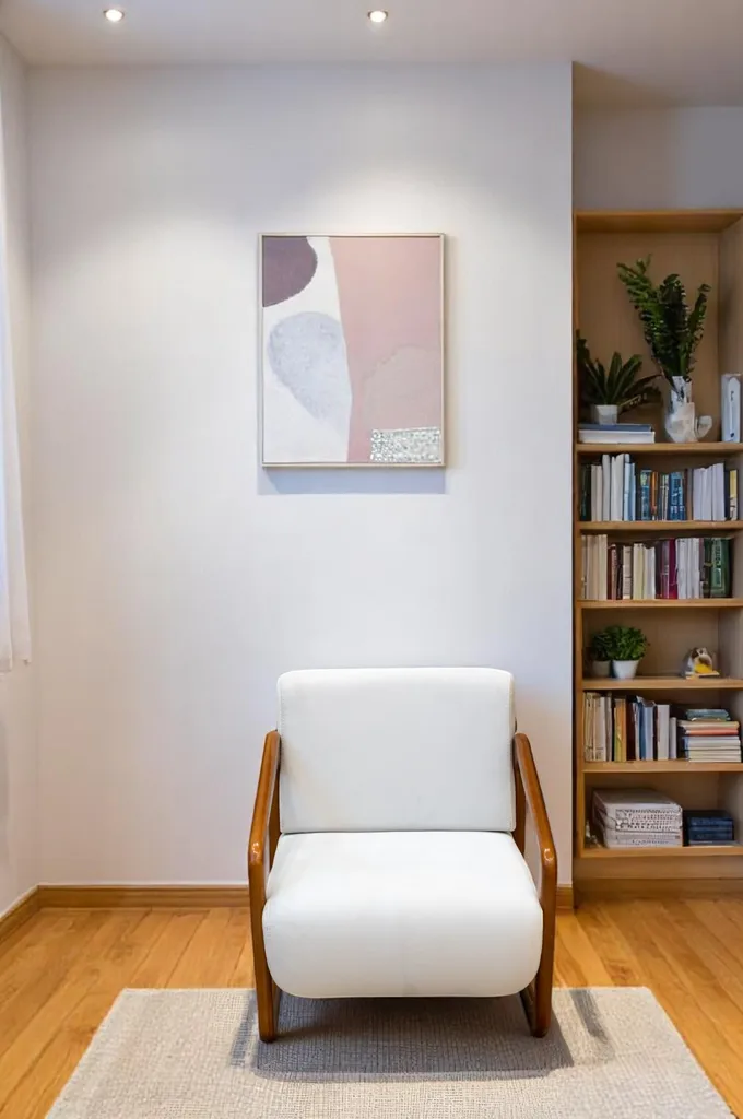 كنبة أنيقة بإطار خشبي بني فاتح وقماش أبيض ناعم بتصميم عصري عملي