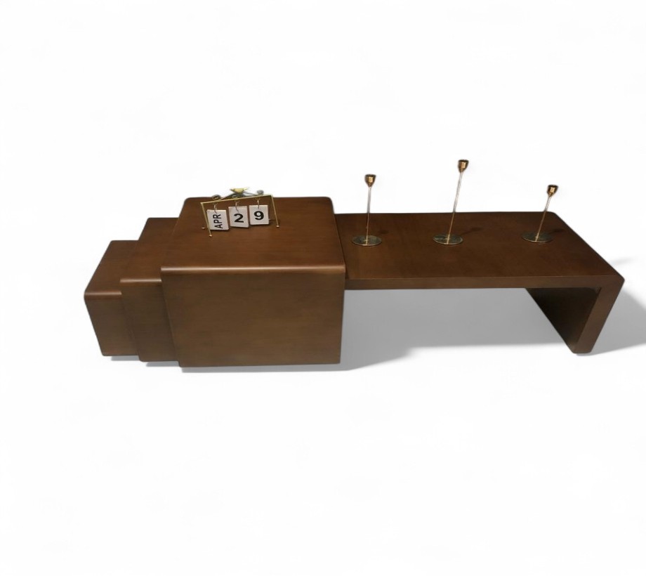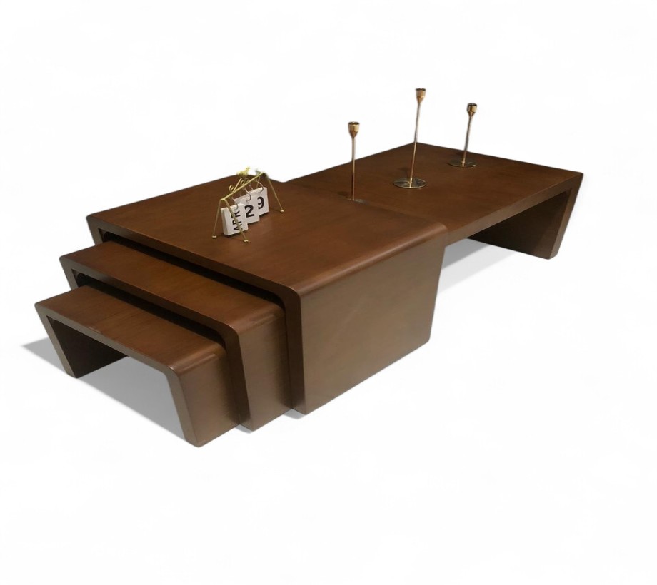 طقم مكوّن من ثلاث طاولات قهوة خشبية بأحجام مختلفة، بتصميم مستطيل مع زوايا مستديرة. تُبرز الطاولات جمال المواد الطبيعية وبراعة التصميم. الطاولة الكبيرة توفر مساحة لتنظيم الطاولات الأصغر داخلها عند عدم الاستخدام، مما يضيف وظيفية وأناقة للمساحة.