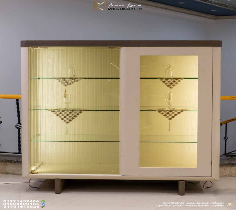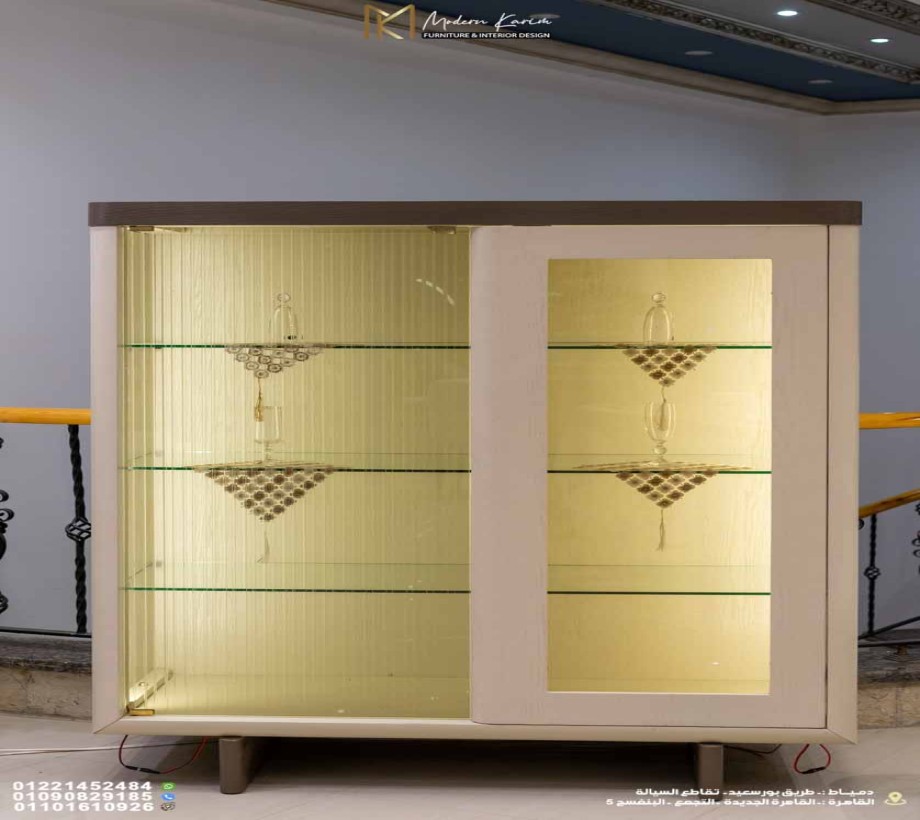 نيش عملي بتفاصيل زجاجية ورفوف فاخرة: لعرض الأواني والتحف بكل فخامة.