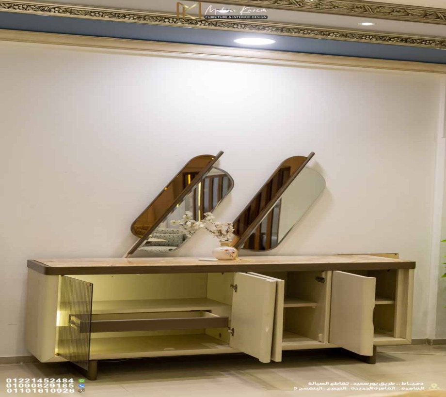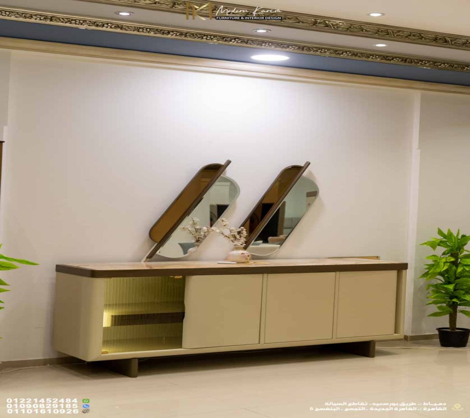 بوفيه مودرن بلمسات معدنية أنيقة: مثالي لتخزين أدوات المائدة وتنظيم المساحة.