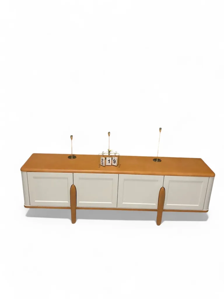 أضف لمسة من الأناقة العملية إلى غرفة المعيشة مع ترابيزة تلفاز خشبية بتصميم بسيط يجمع بين الجمال والوظيفة. تأتي الطاولة بسطح خشبي بلون بني فاتح يمنح المكان دفئًا طبيعيًا، بينما تضيف الأبواب البيضاء تباينًا عصريًا أنيقًا يلفت الأنظار.