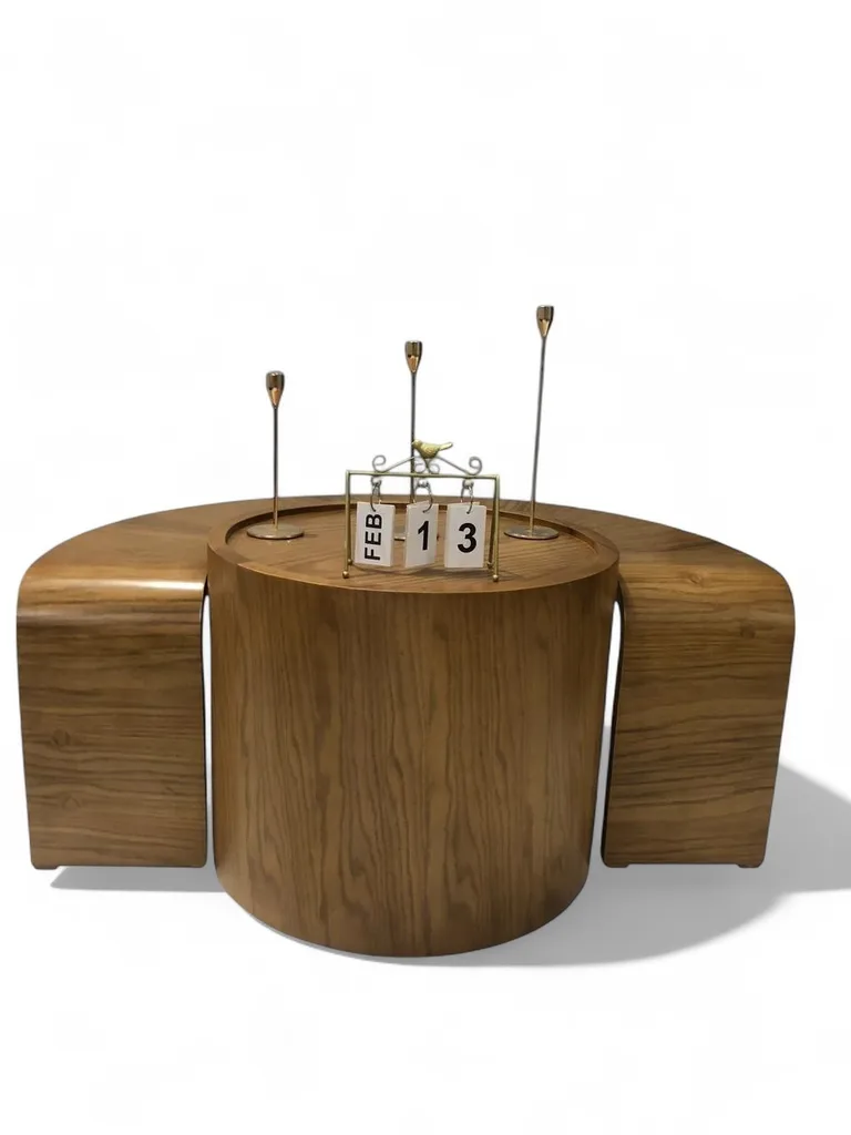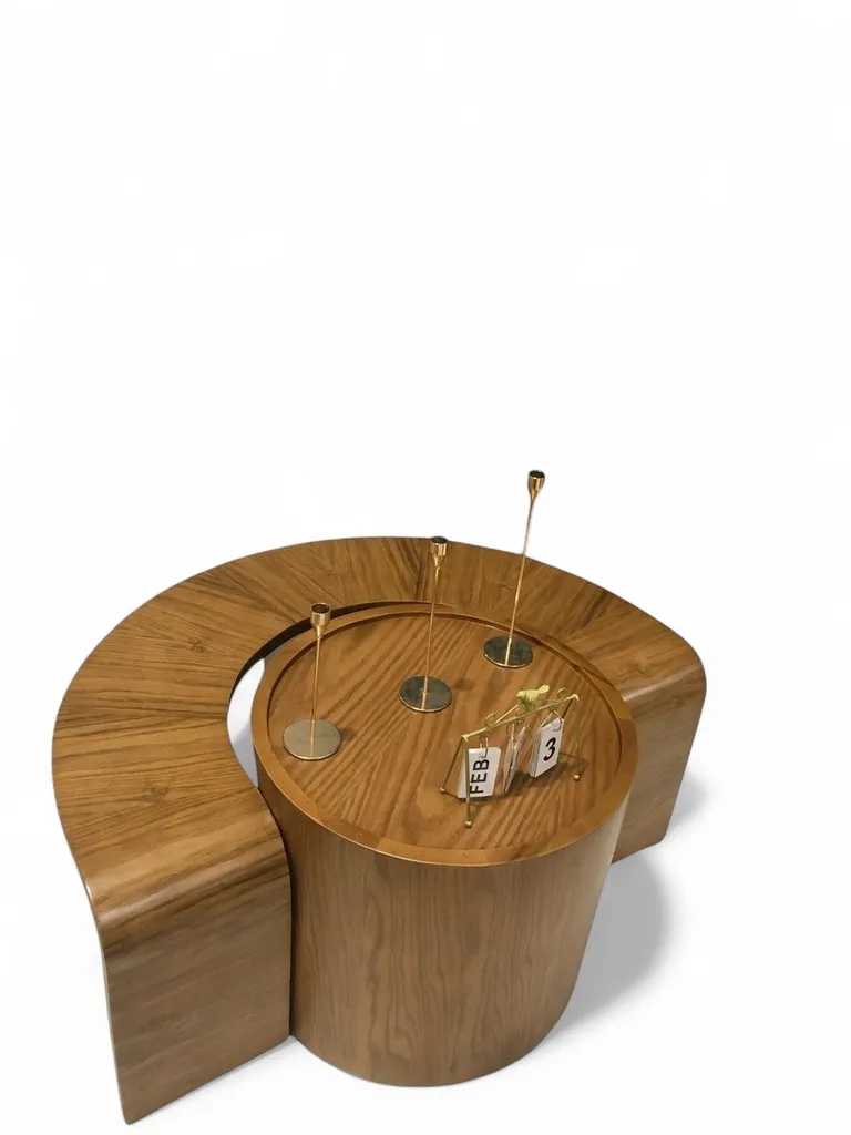 ترابيزة قهوة فريدة تجمع بين الأناقة والبساطة في تصميم مكون من قطعتين متناسقتين. القطعة المركزية تأخذ شكل أسطواني ناعم يعكس جمال الخشب الطبيعي بنقوشه وانسيابيته الدافئة، بينما تمتد من حولها إضافات نصف دائرية تمنح الترابيزة مظهراً متناغماً من الأعلى. يتميز السطح الخشبي بلمسة دافئة ورقيقة، مع خطوط نظيفة تعكس روح التصميم العصري الذي يجمع بين الحداثة والراحة.