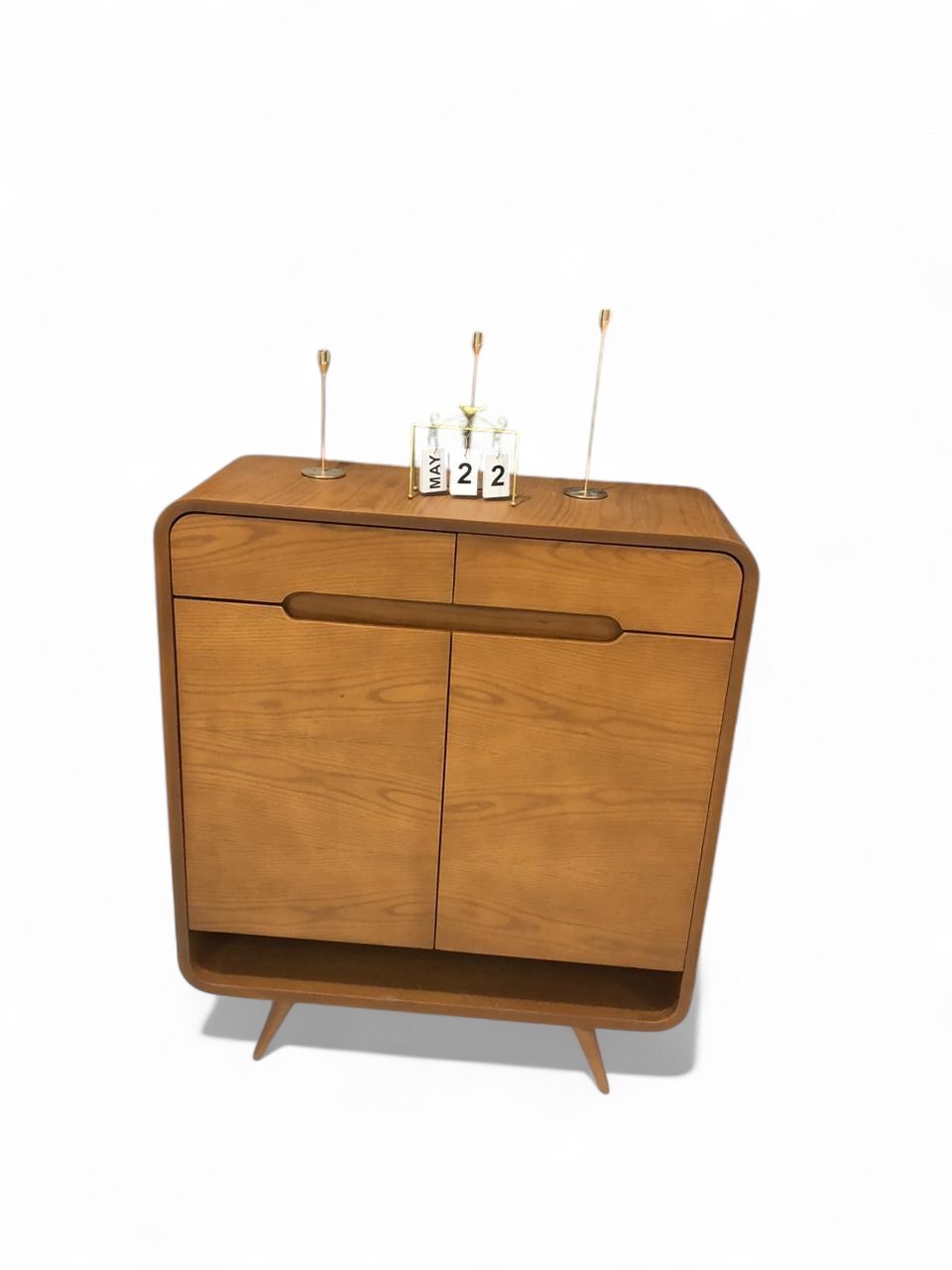 خزانة أحذية أنيقة مصنوعة من الخشب بتصميم مستوحى من الطراز العصري الكلاسيكي، تجمع بين البساطة والدفء الطبيعي. يتميز سطحها الأملس بإبراز نقوش الخشب الطبيعية، ما يمنحها لمسة راقية تتناغم مع مختلف أنماط الديكور الداخلي. تحتوي على بابين مزودين بمقبض أفقي يمتد عبر الجزء العلوي، ما يوفر سهولة في الفتح والوصول إلى المحتوى الداخلي.